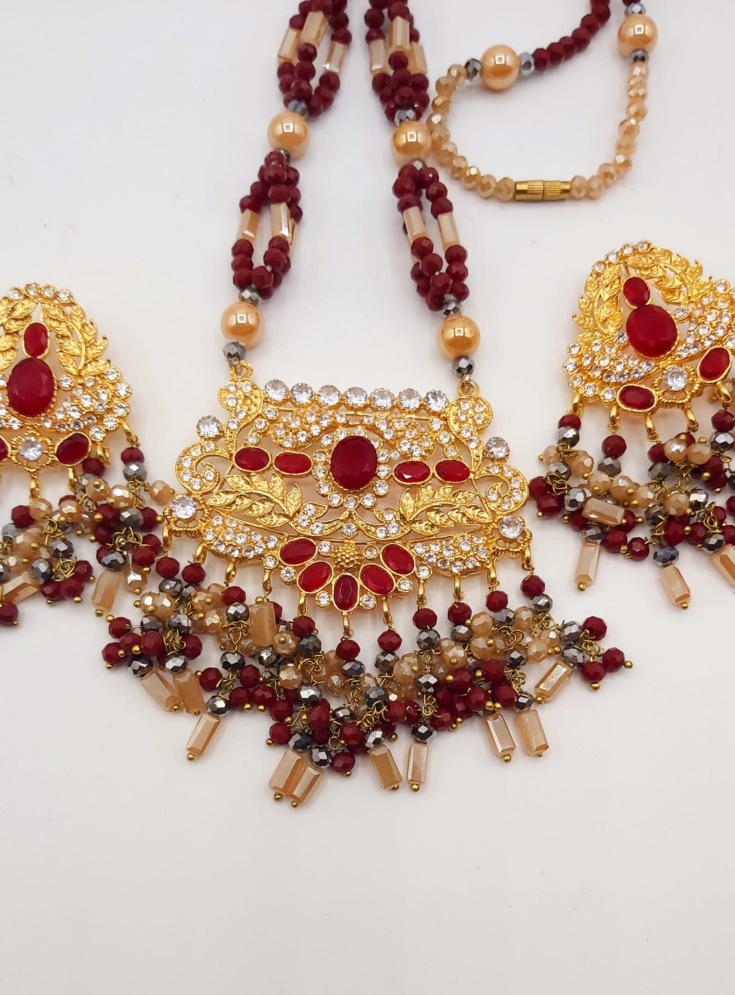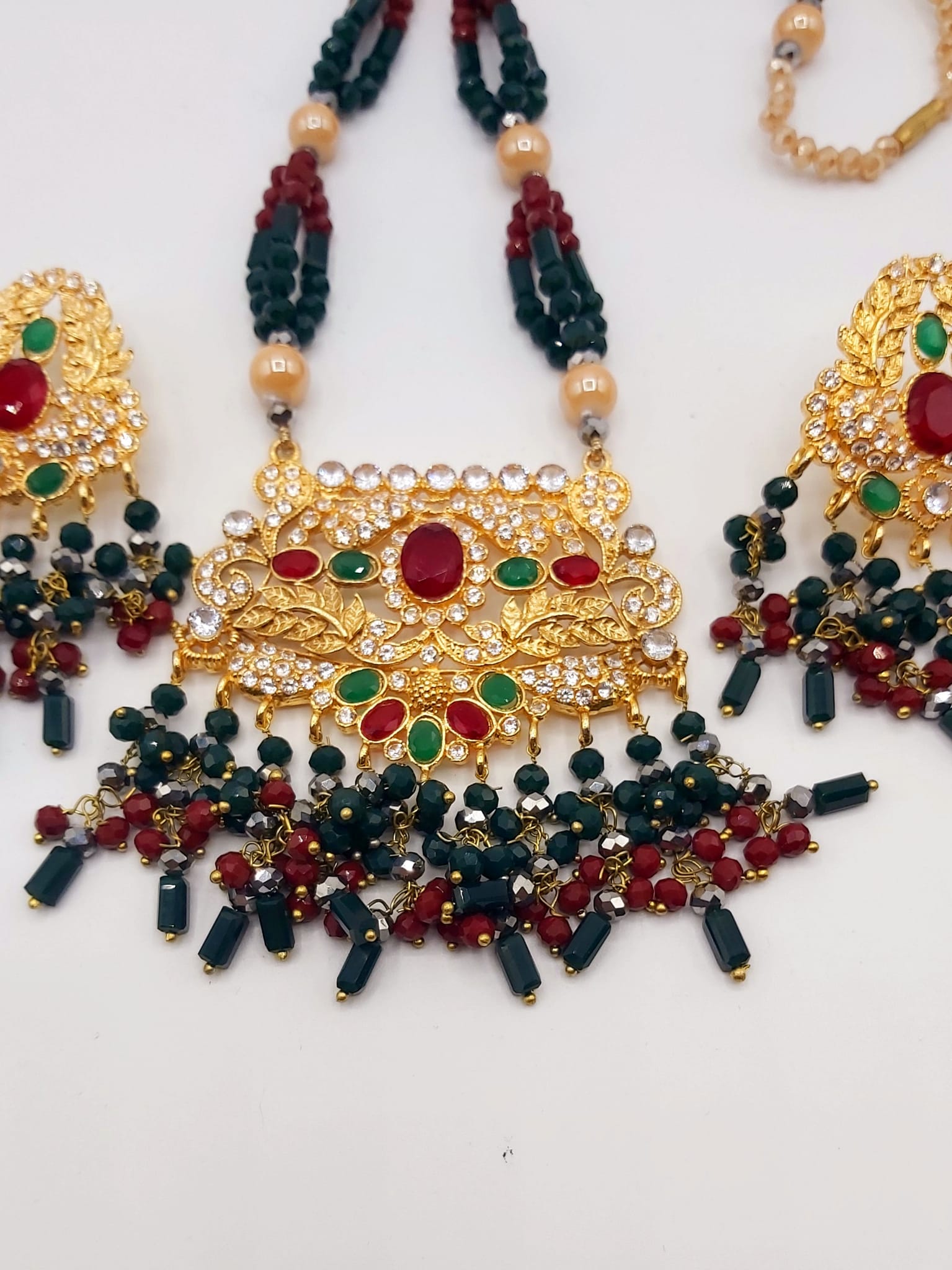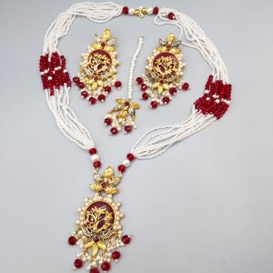 Enhance your look with this exquisite long necklace and matching earrings set, beautifully handcrafted to reflect the charm of Pakistani-Indian tradition. Designed with intricate detailing and premium finishing, this set adds a touch of regal elegance to any bridal or festive ensemble.