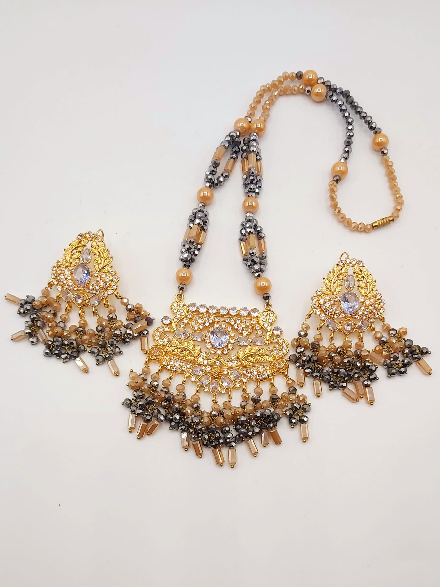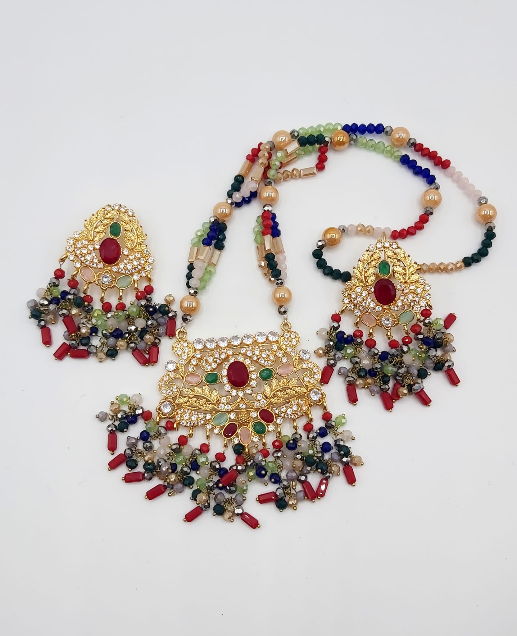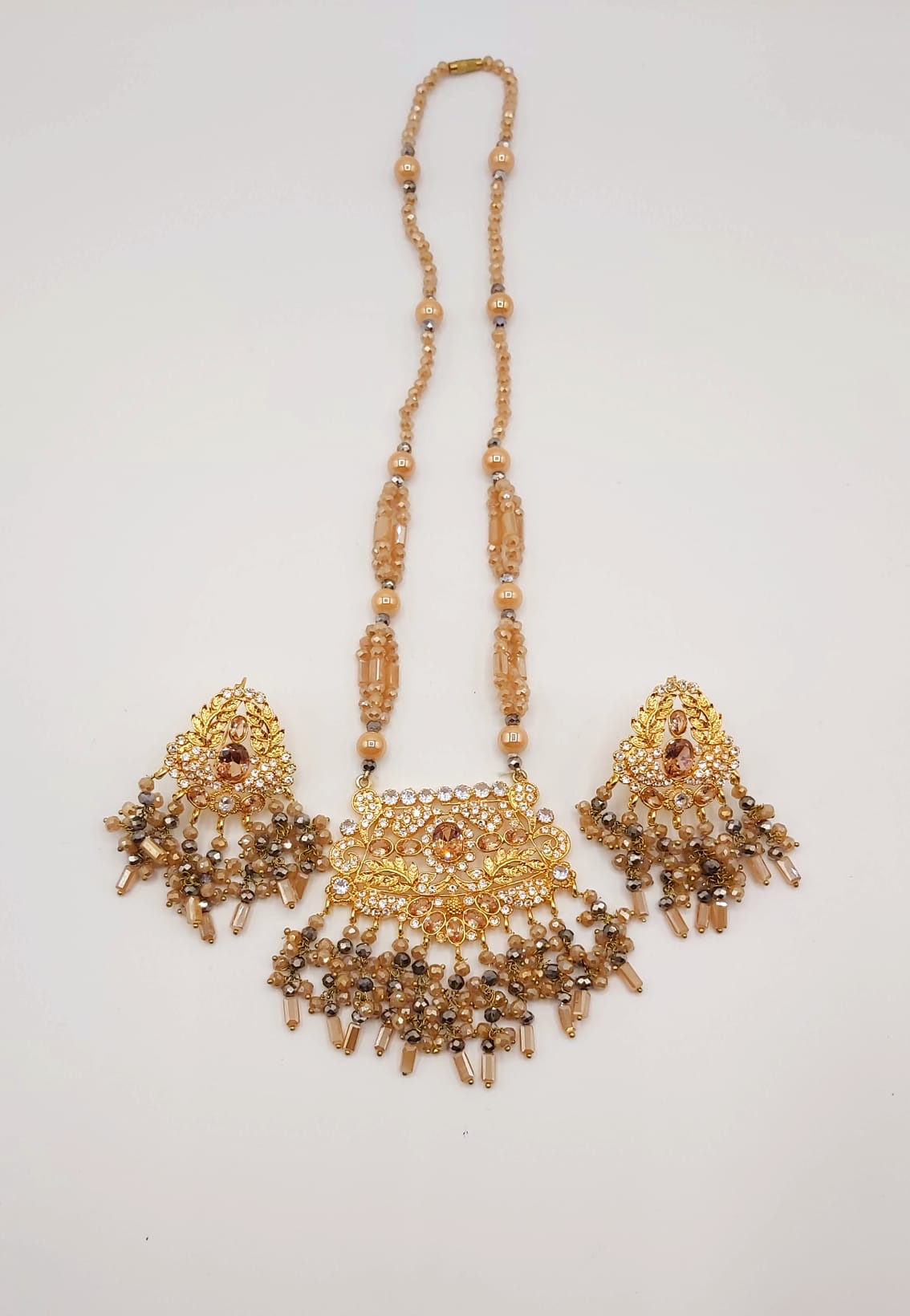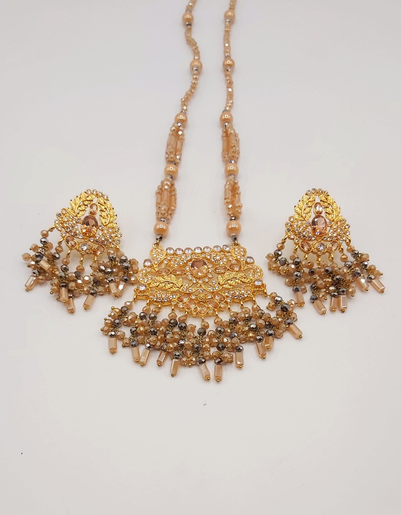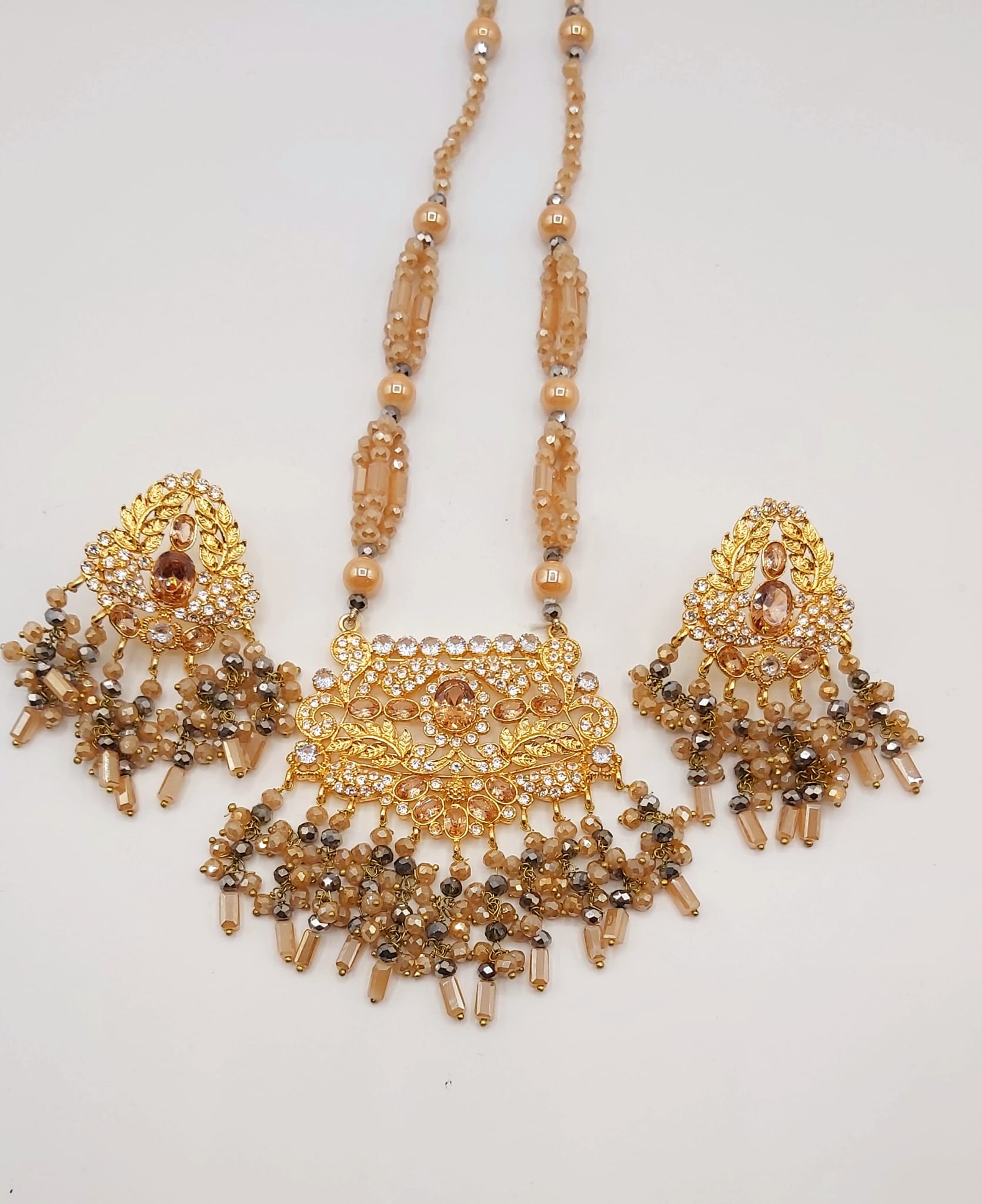 The long necklace drapes gracefully, creating a statement of sophistication, while the coordinated earrings complete the look with perfect harmony. Whether worn for weddings, formal events, or cultural celebrations, this set captures timeless beauty and artisanal craftsmanship.