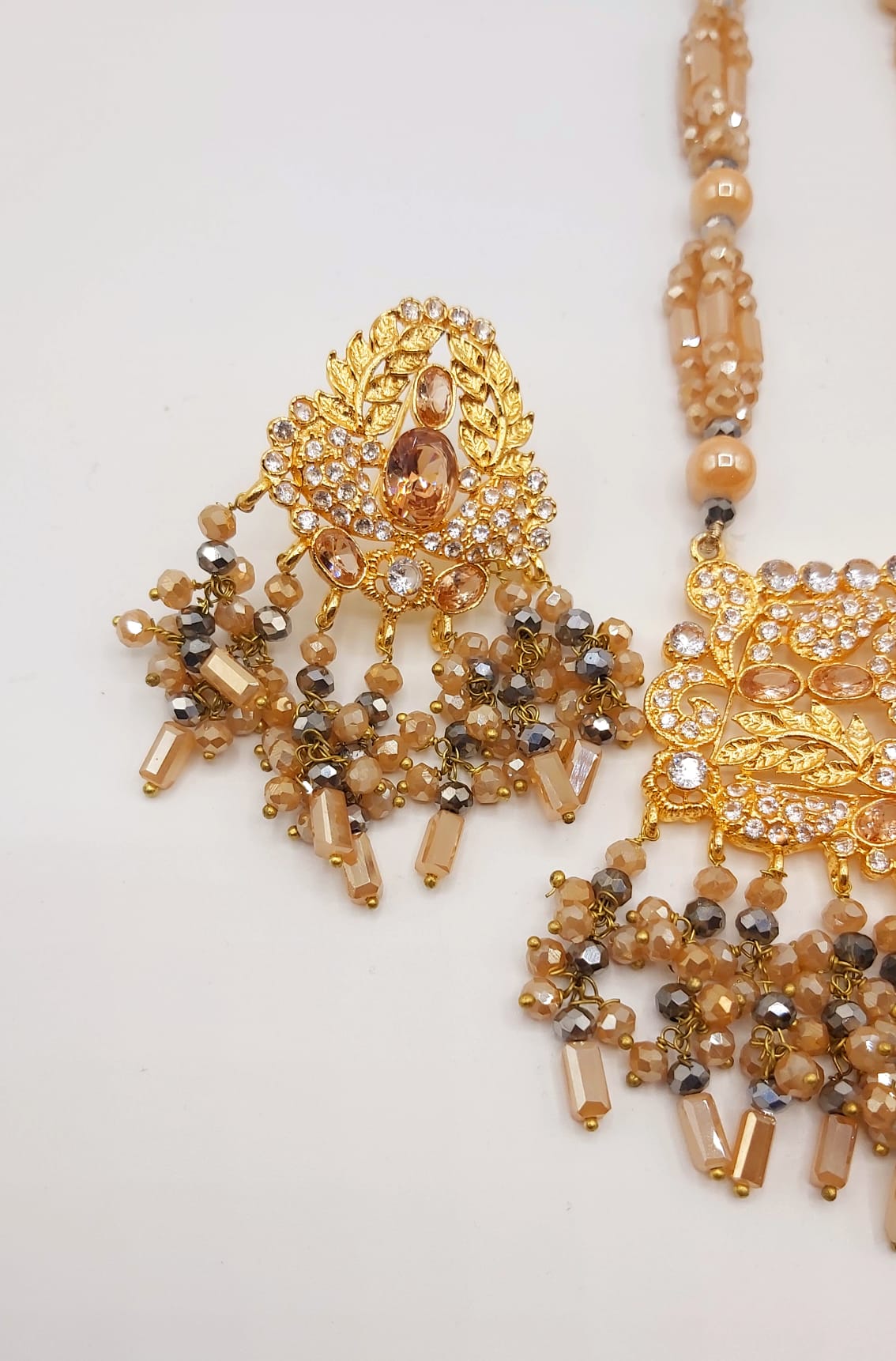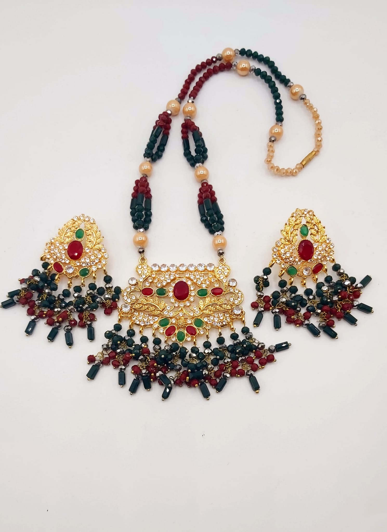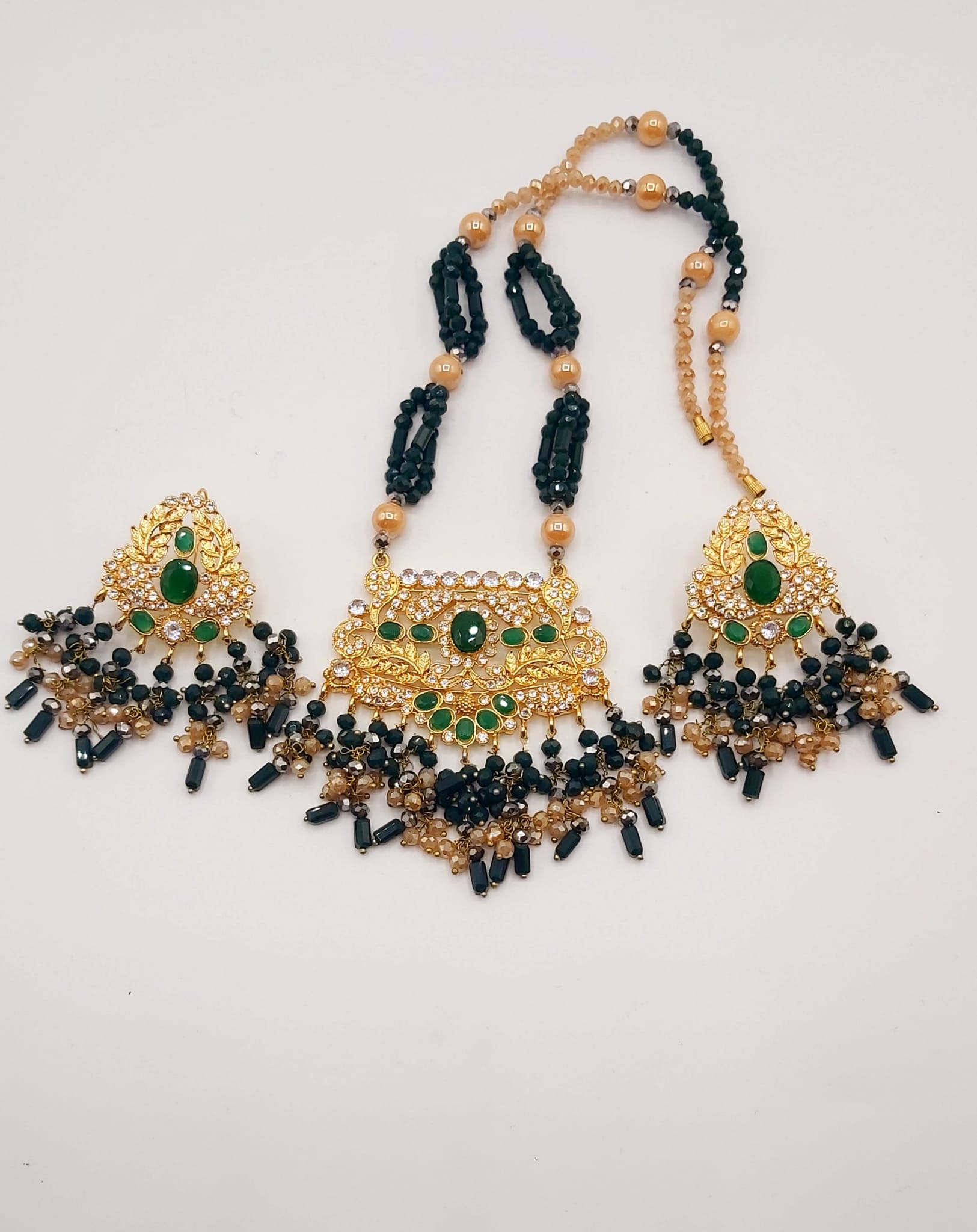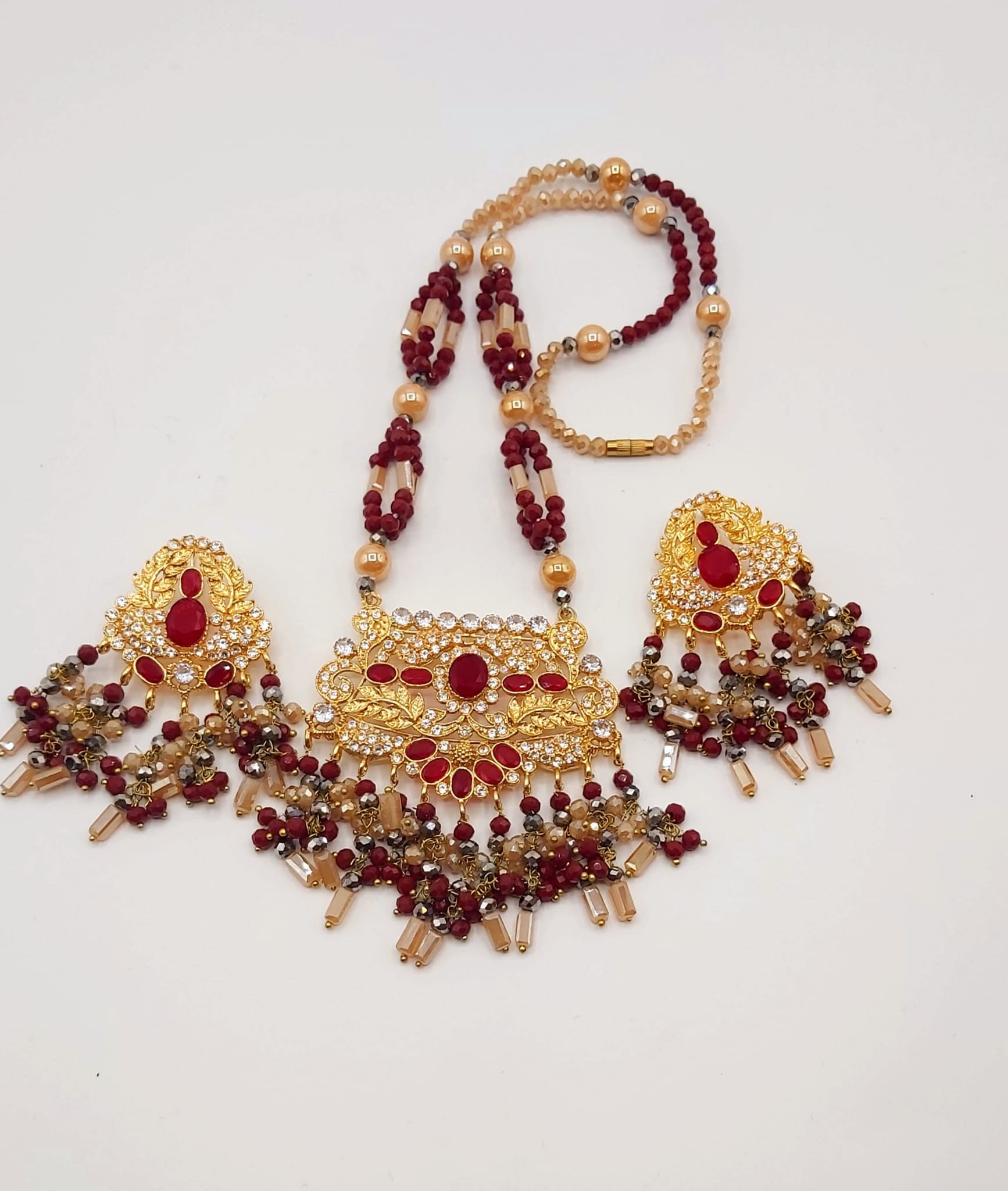 The long necklace drapes gracefully, creating a statement of sophistication, while the coordinated earrings complete the look with perfect harmony. Whether worn for weddings, formal events, or cultural celebrations, this set captures timeless beauty and artisanal craftsmanship.