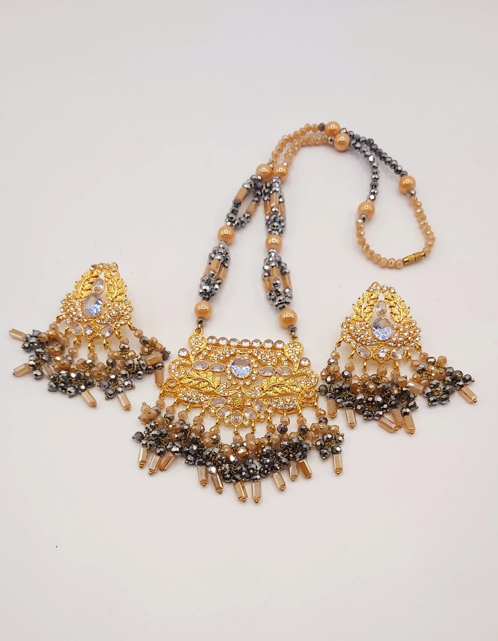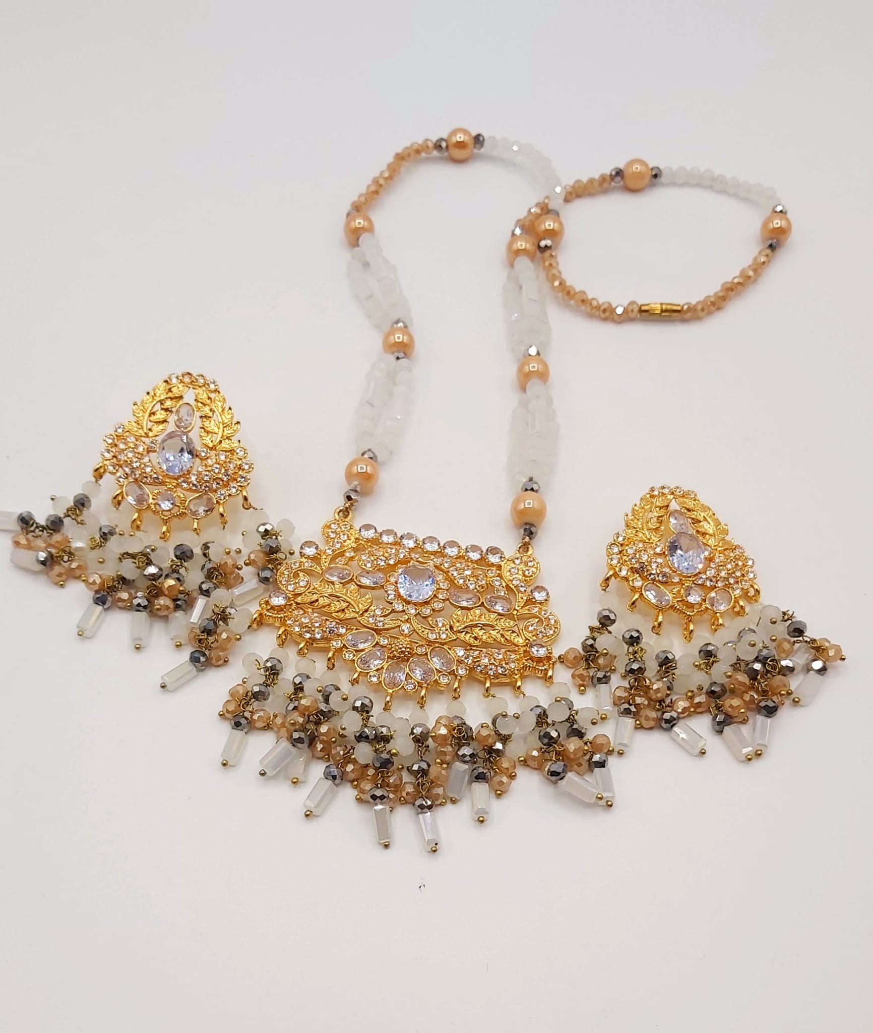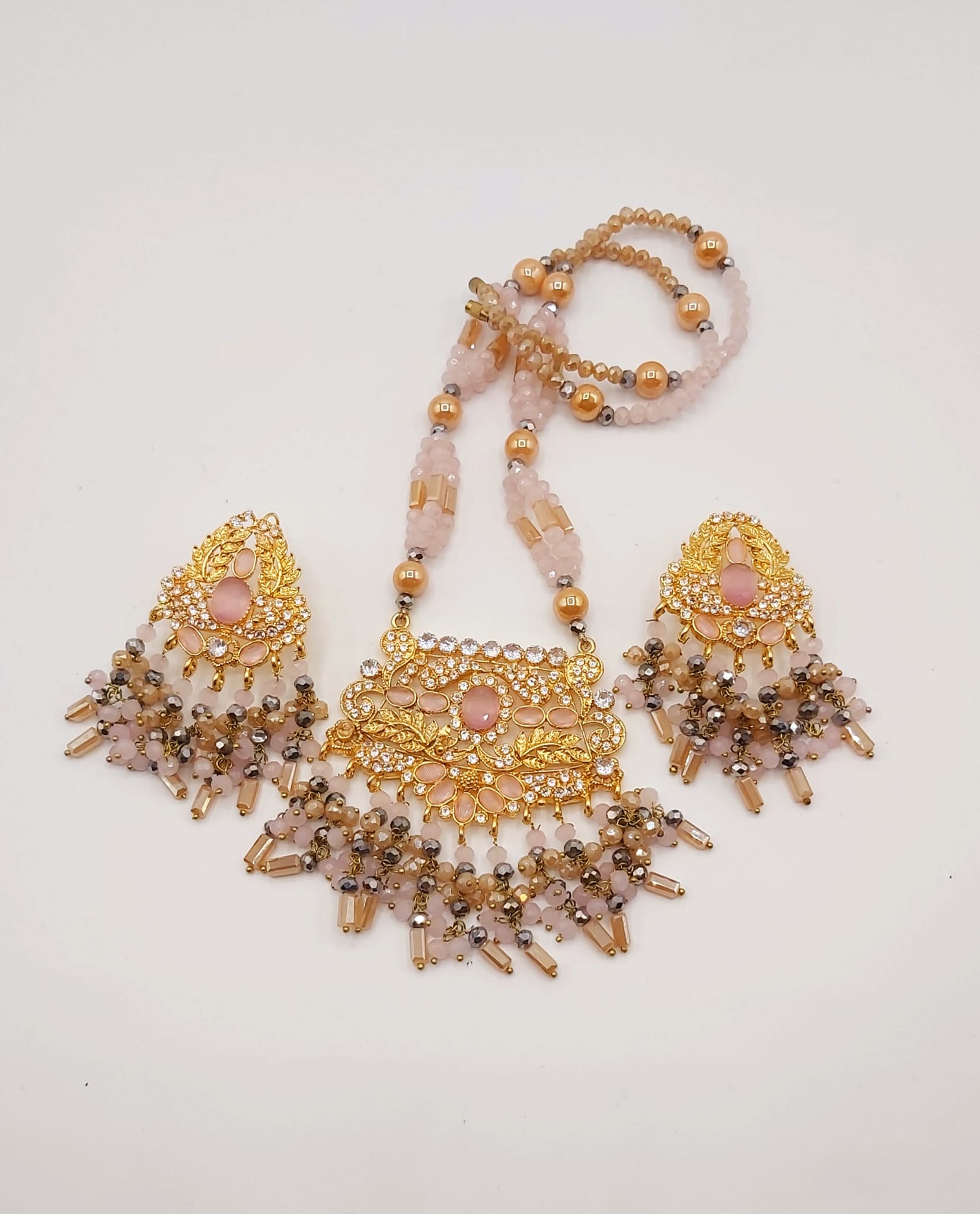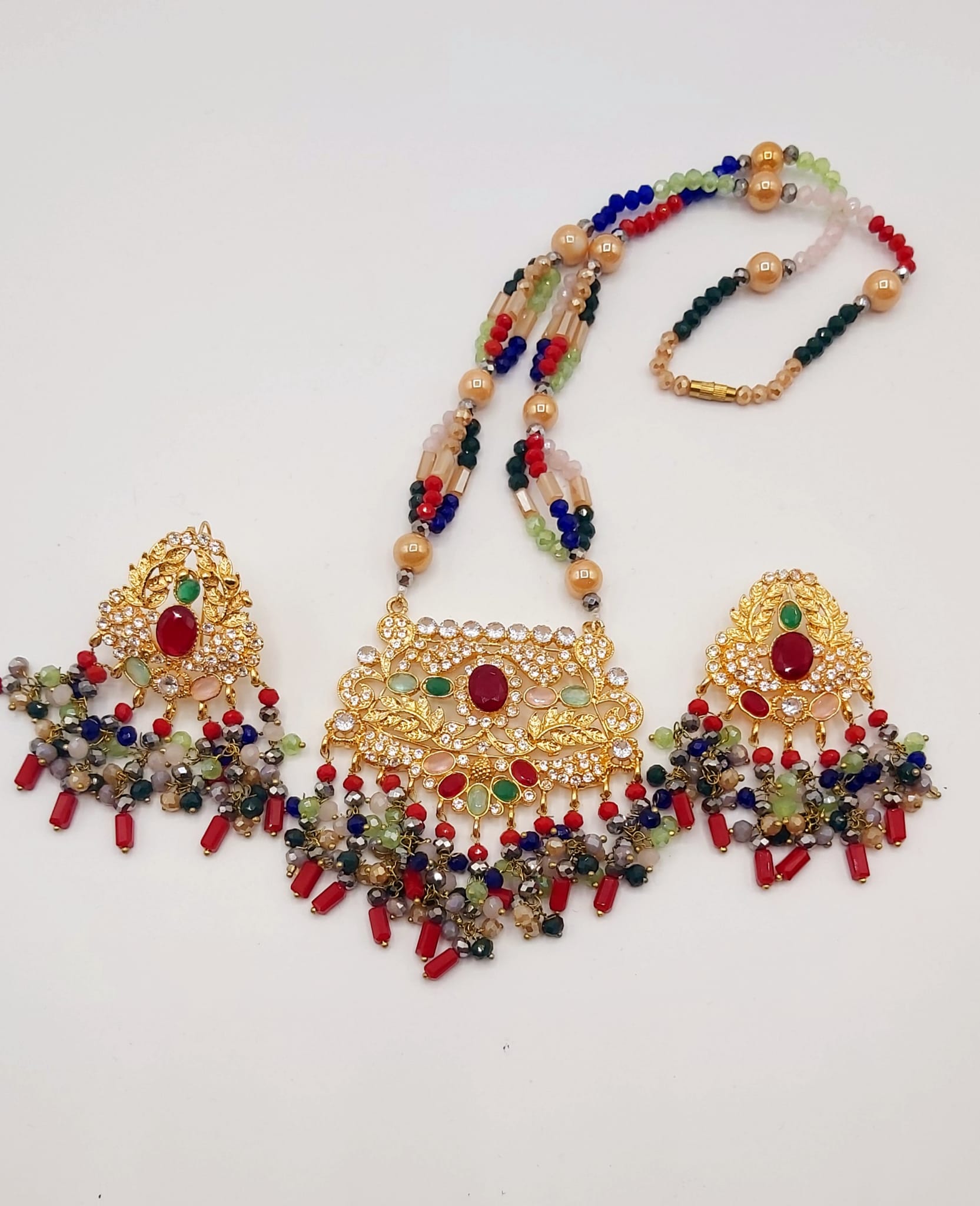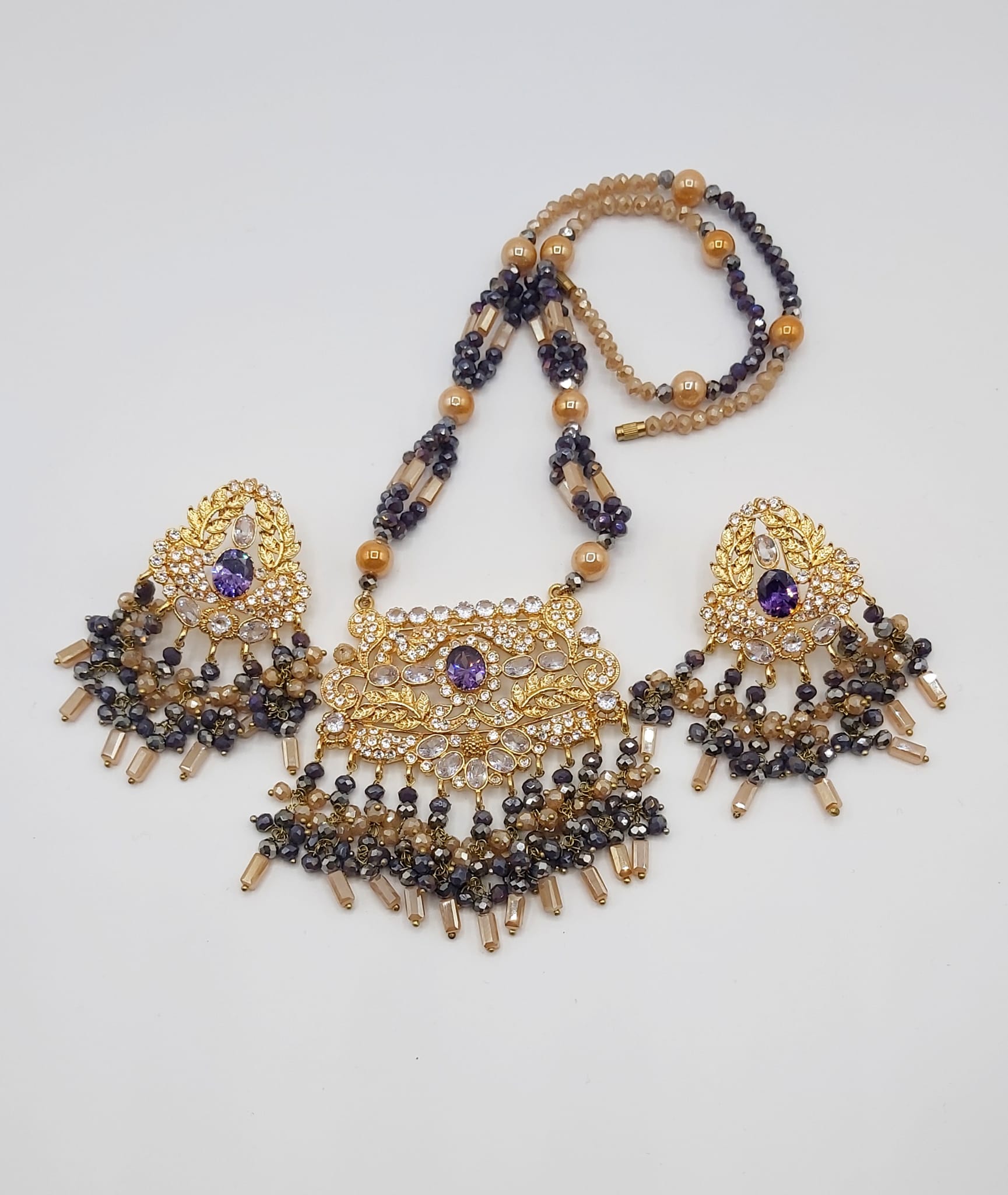 The long necklace drapes gracefully, creating a statement of sophistication, while the coordinated earrings complete the look with perfect harmony. Whether worn for weddings, formal events, or cultural celebrations, this set captures timeless beauty and artisanal craftsmanship.
