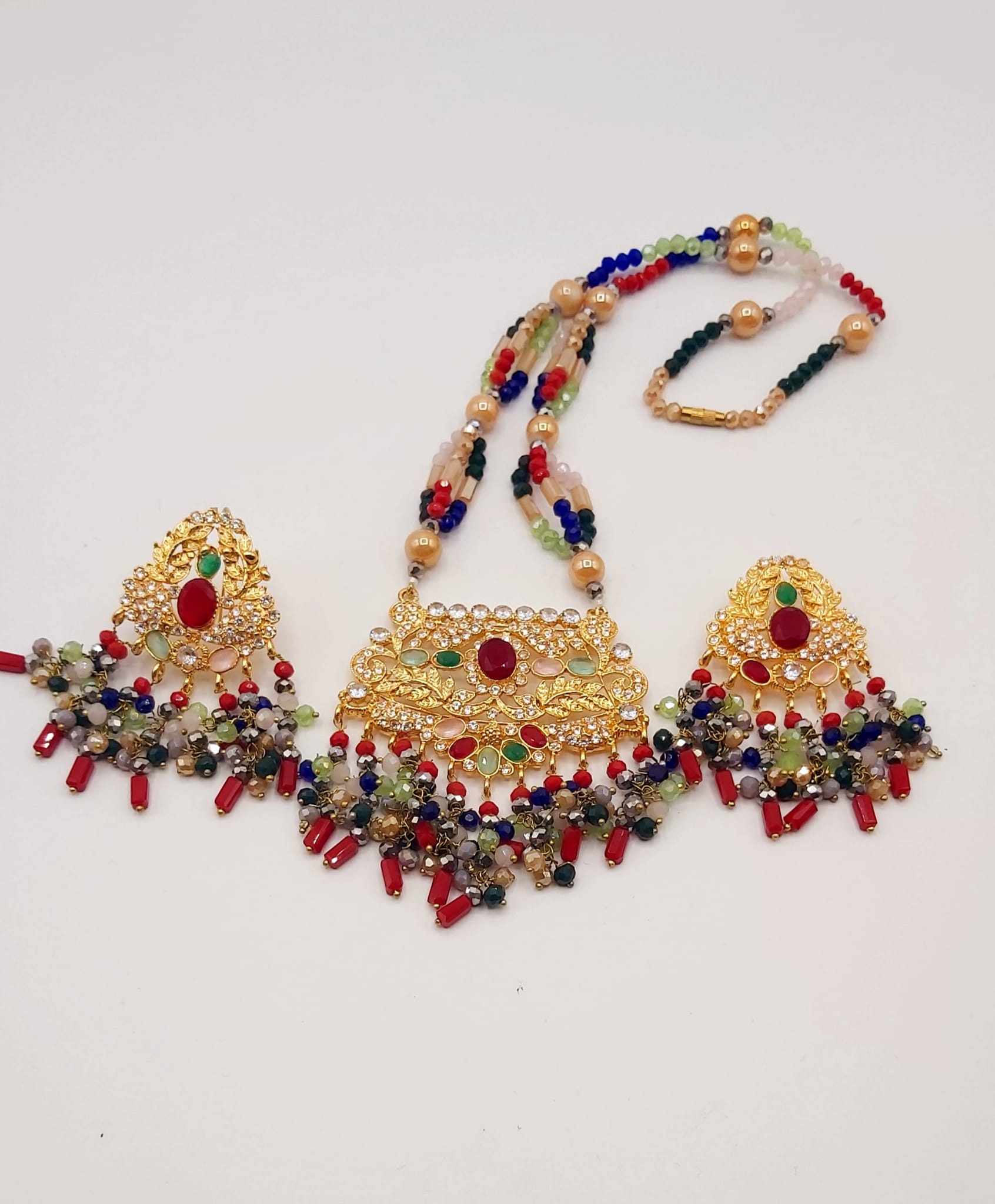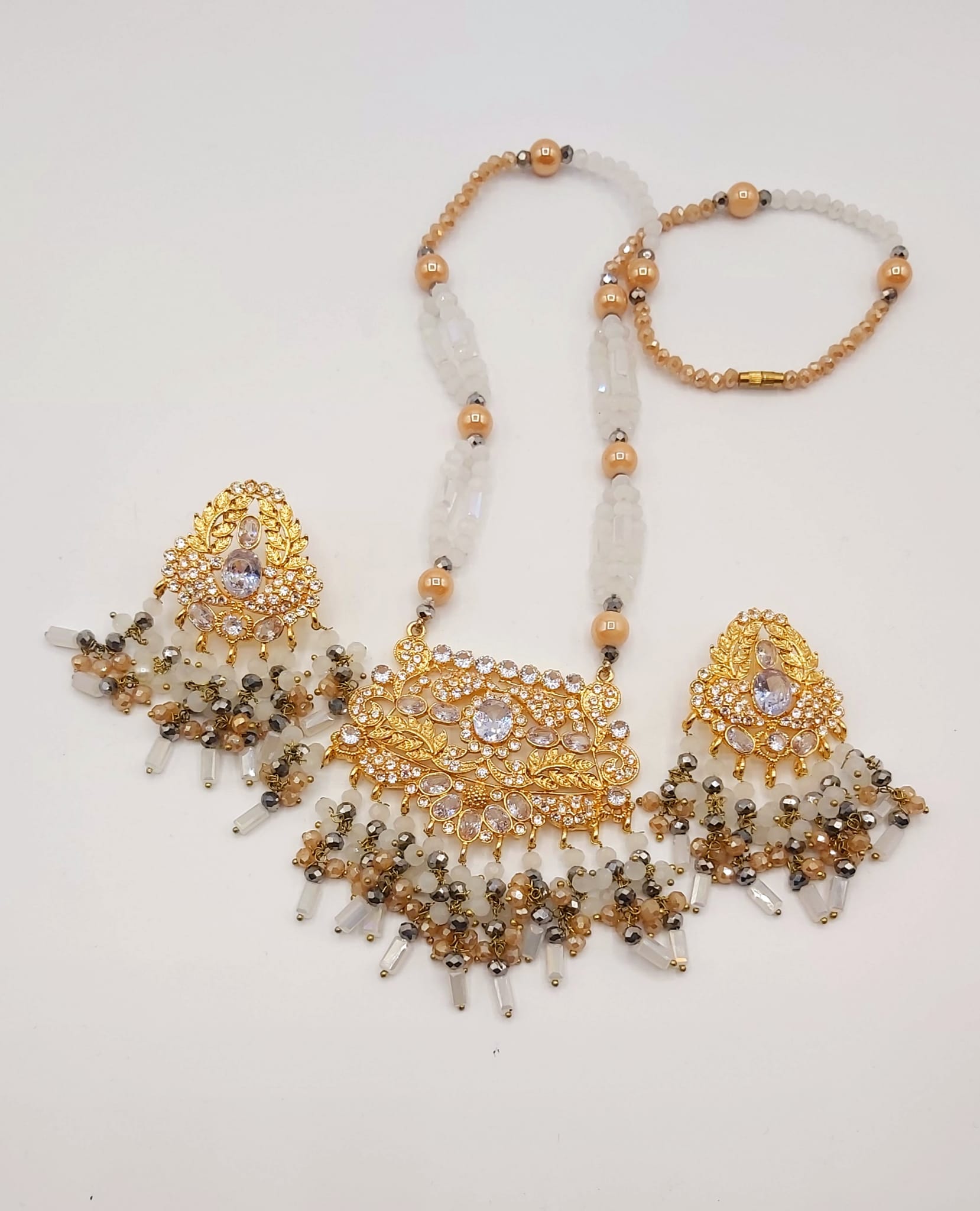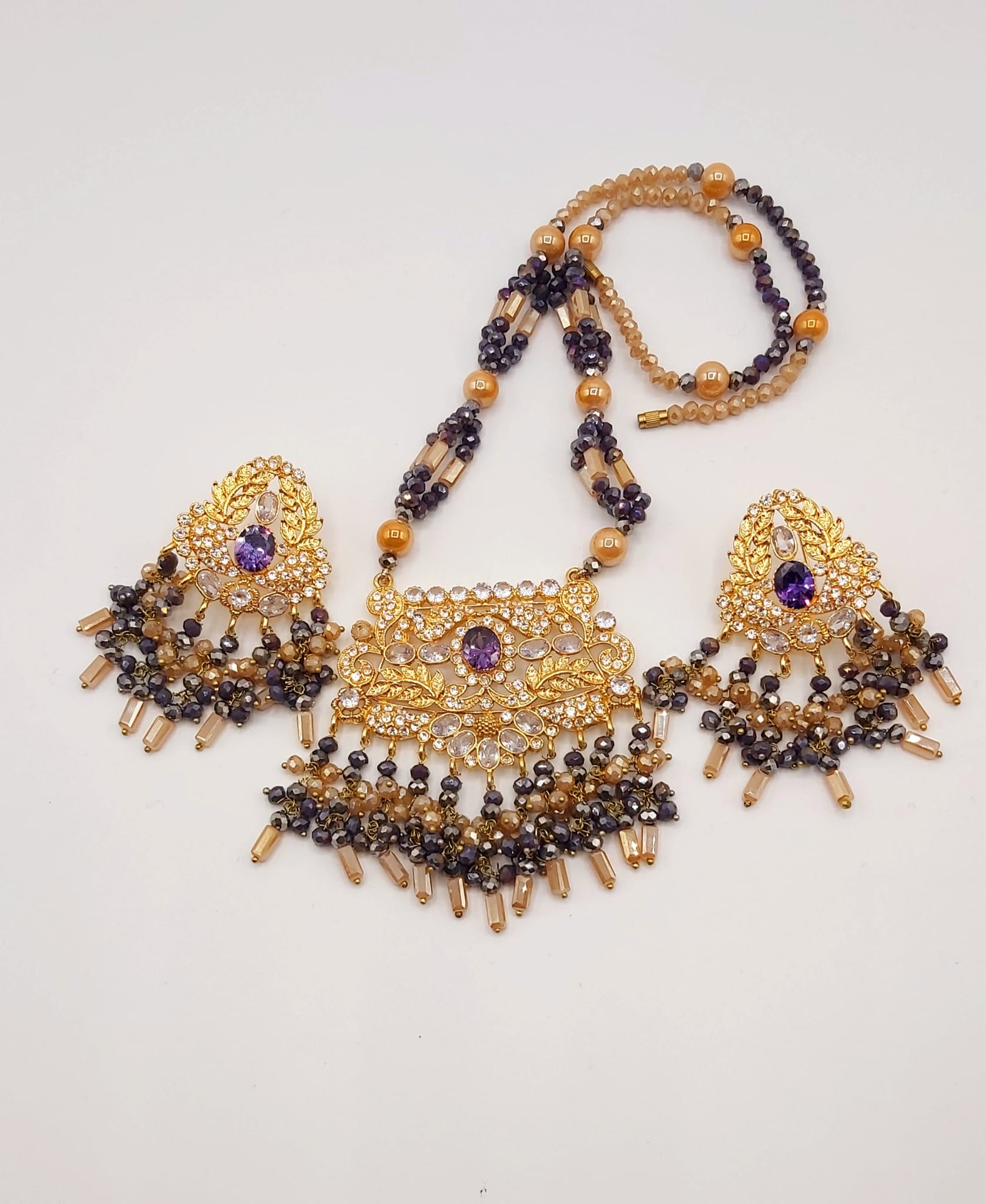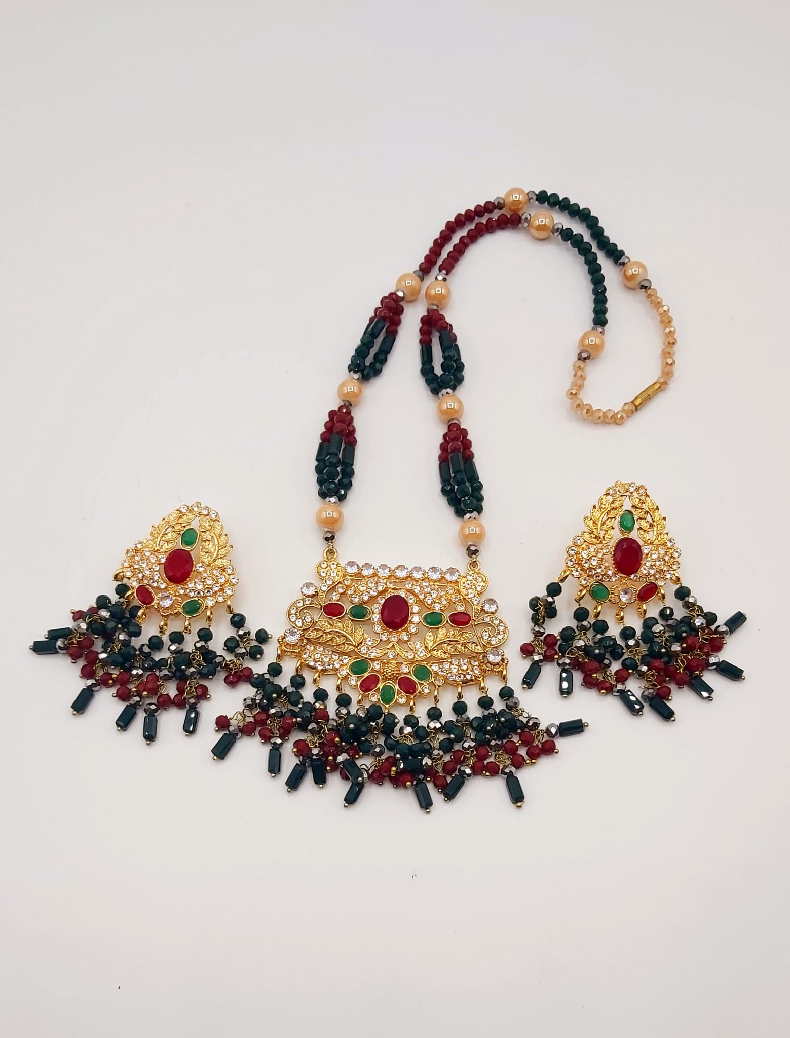 The long necklace drapes gracefully, creating a statement of sophistication, while the coordinated earrings complete the look with perfect harmony. Whether worn for weddings, formal events, or cultural celebrations, this set captures timeless beauty and artisanal craftsmanship.