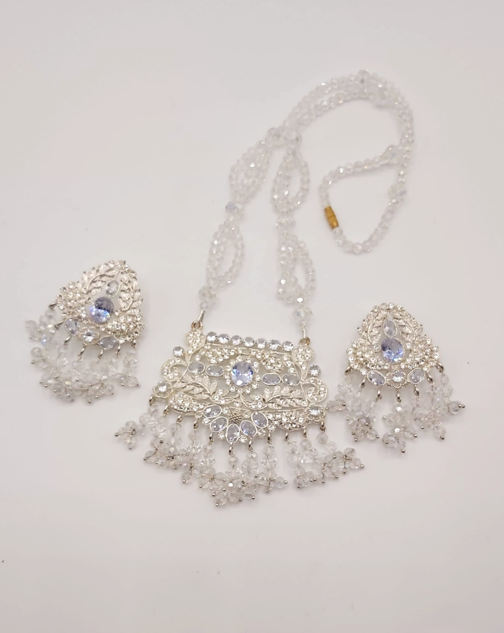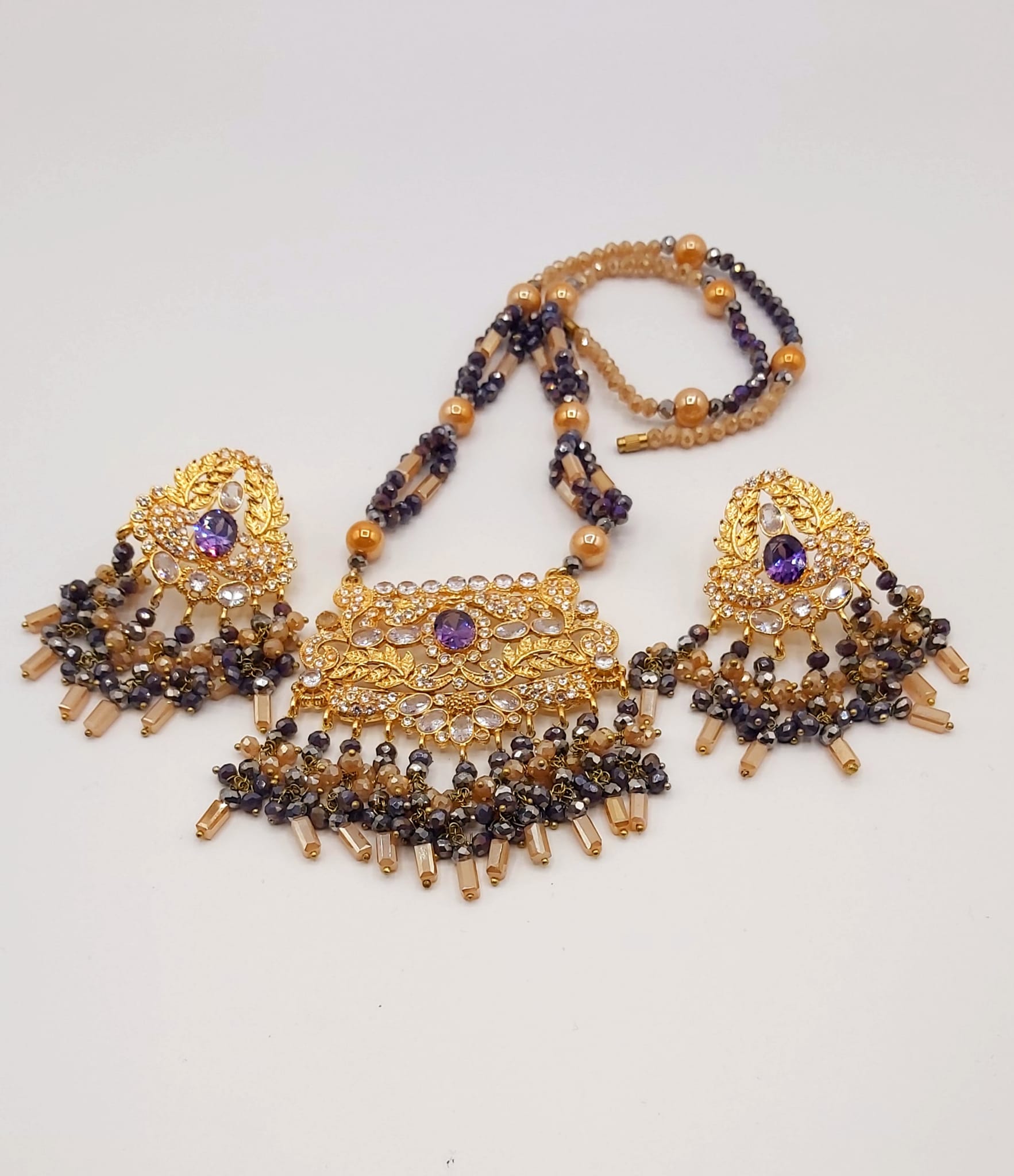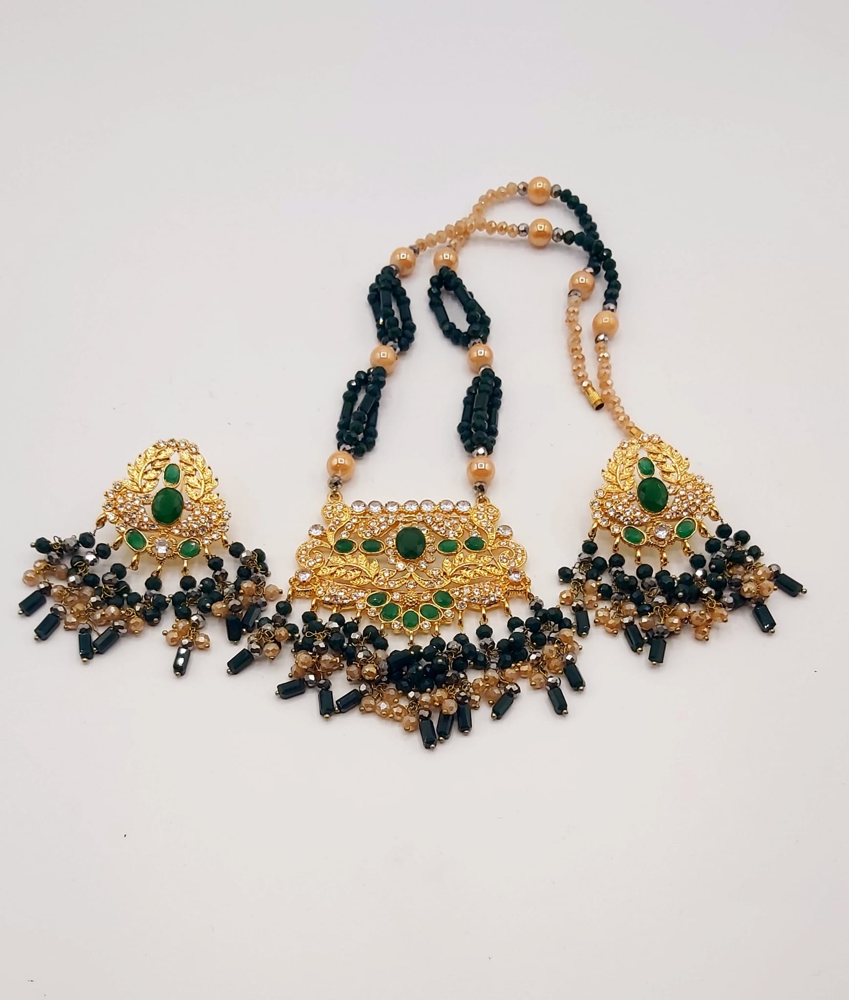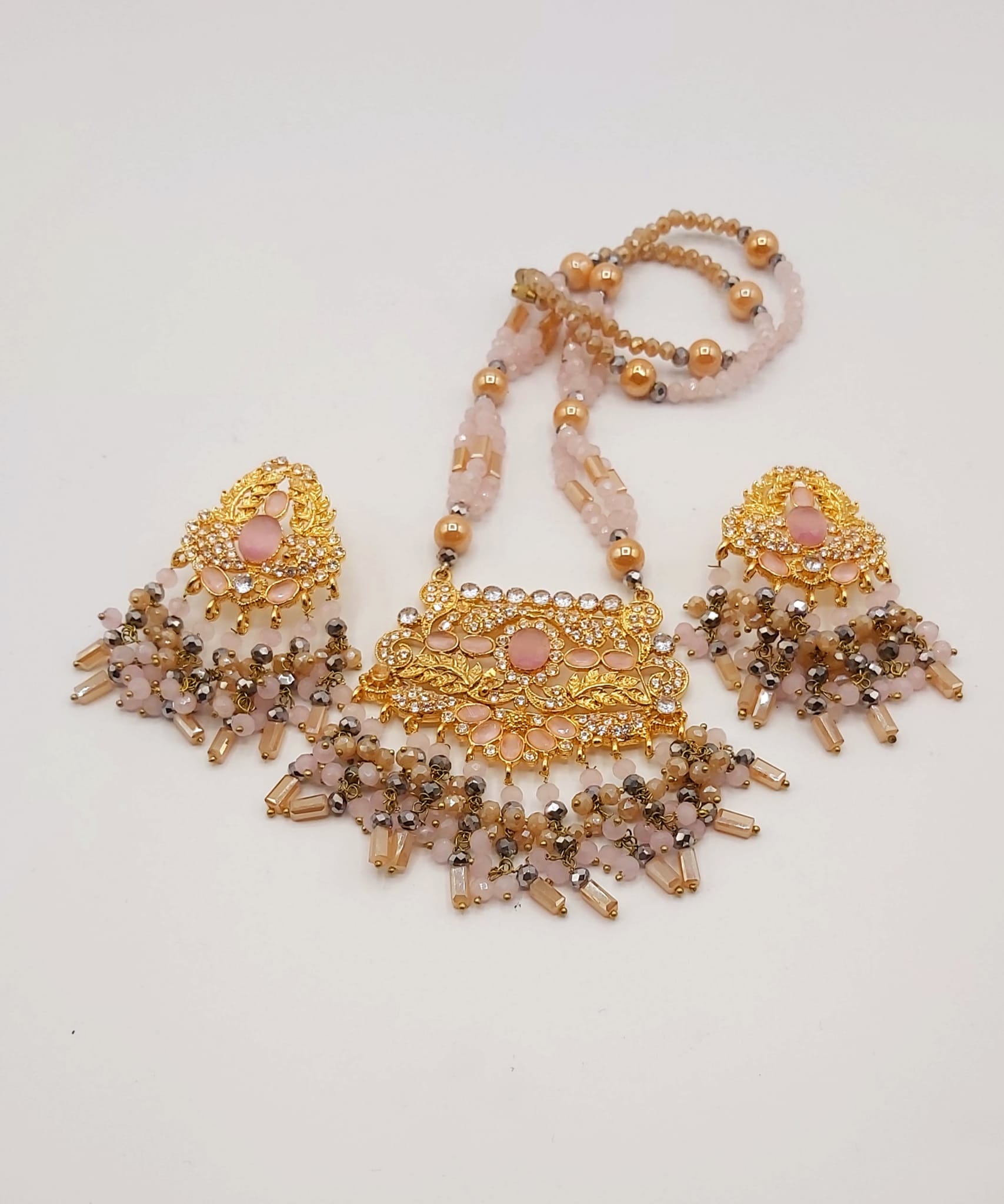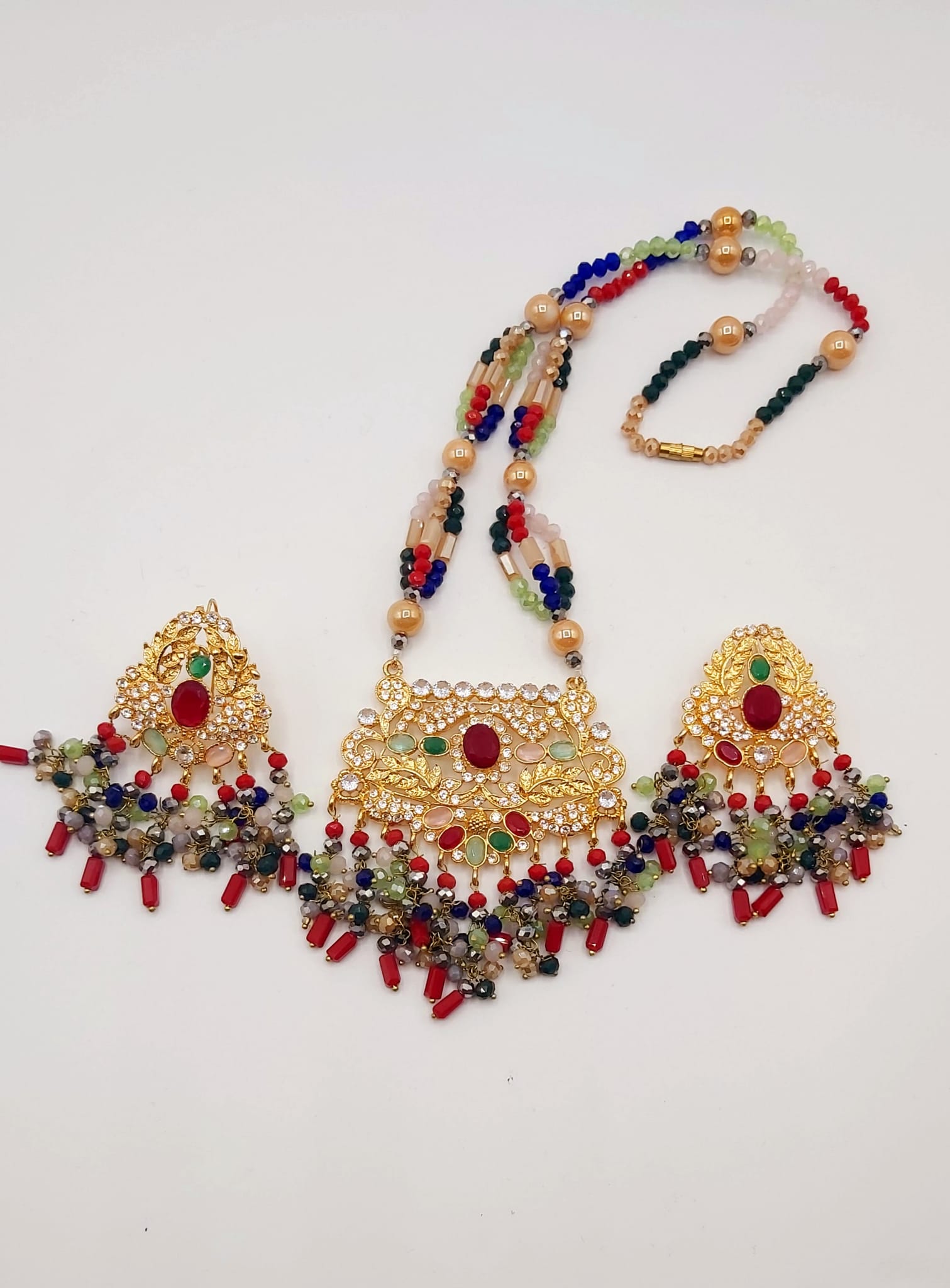 The long necklace drapes gracefully, creating a statement of sophistication, while the coordinated earrings complete the look with perfect harmony. Whether worn for weddings, formal events, or cultural celebrations, this set captures timeless beauty and artisanal craftsmanship.