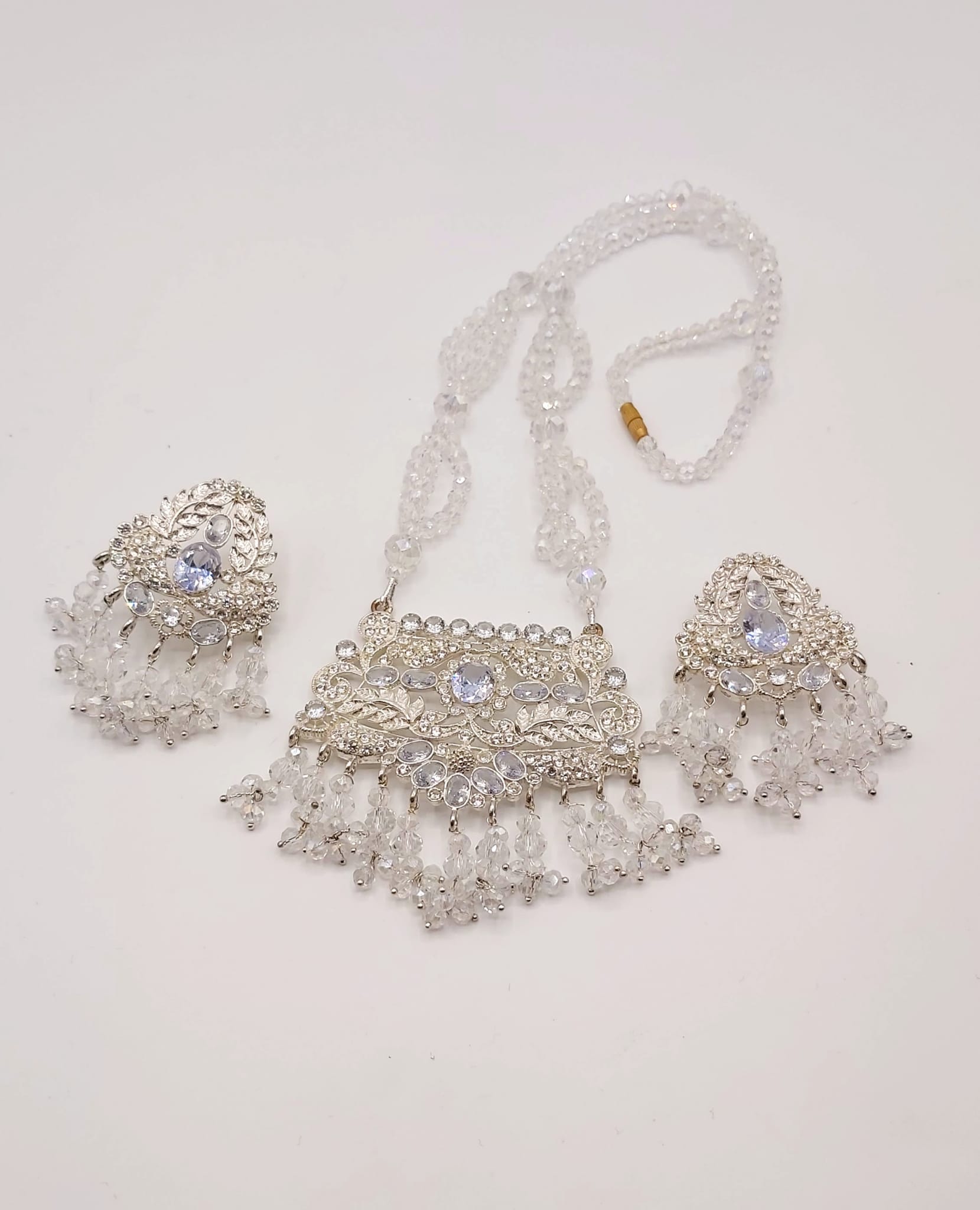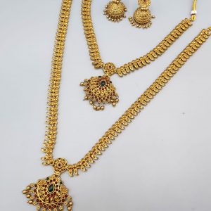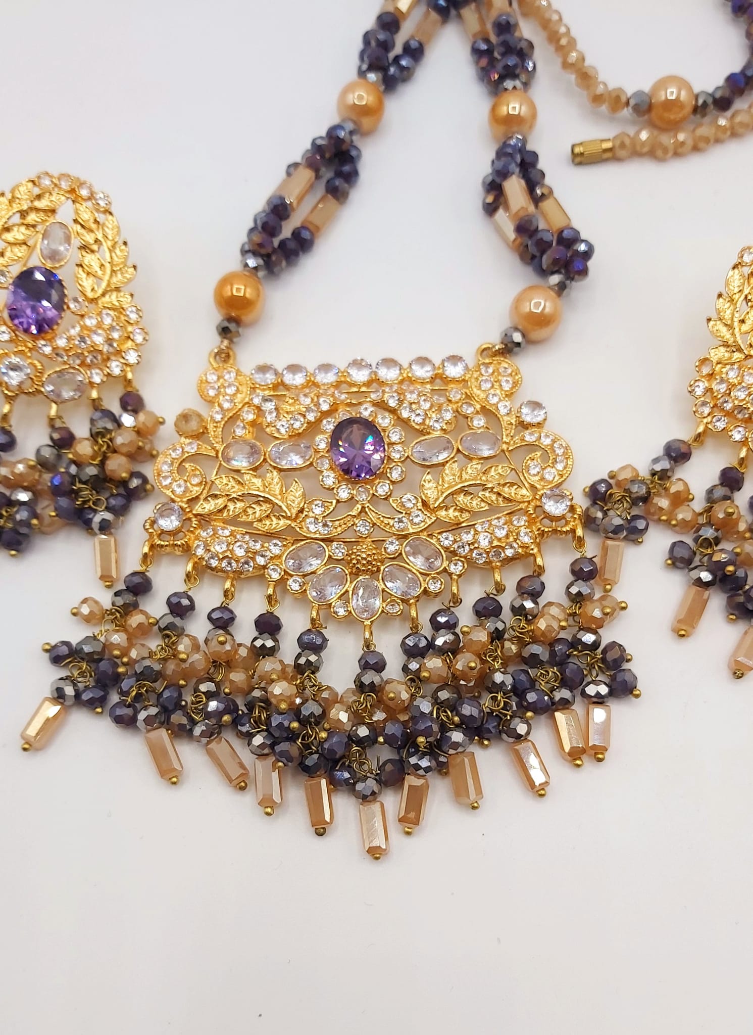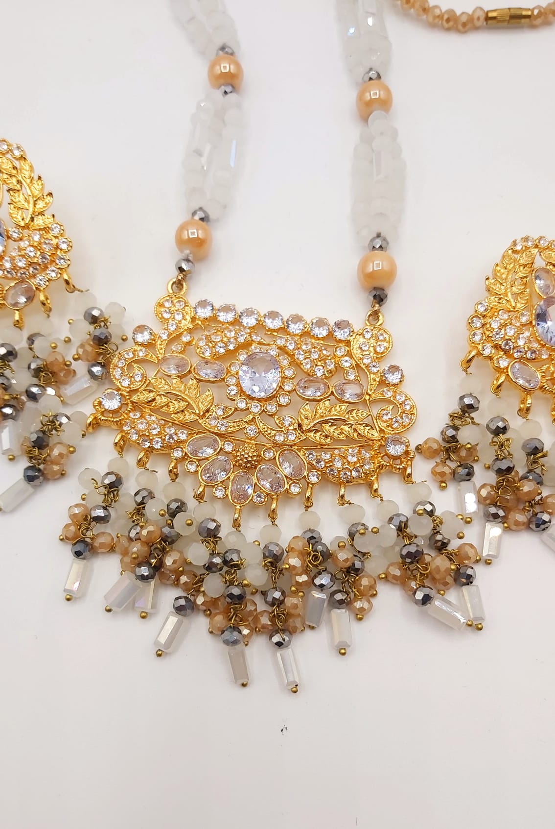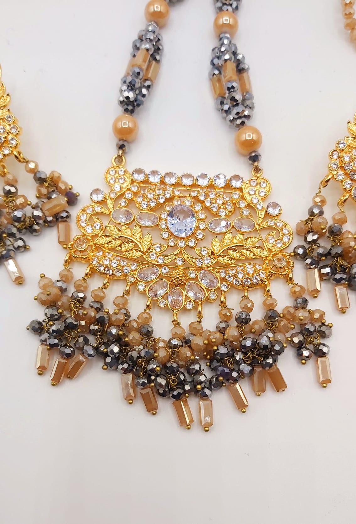 The long necklace drapes gracefully, creating a statement of sophistication, while the coordinated earrings complete the look with perfect harmony. Whether worn for weddings, formal events, or cultural celebrations, this set captures timeless beauty and artisanal craftsmanship.
