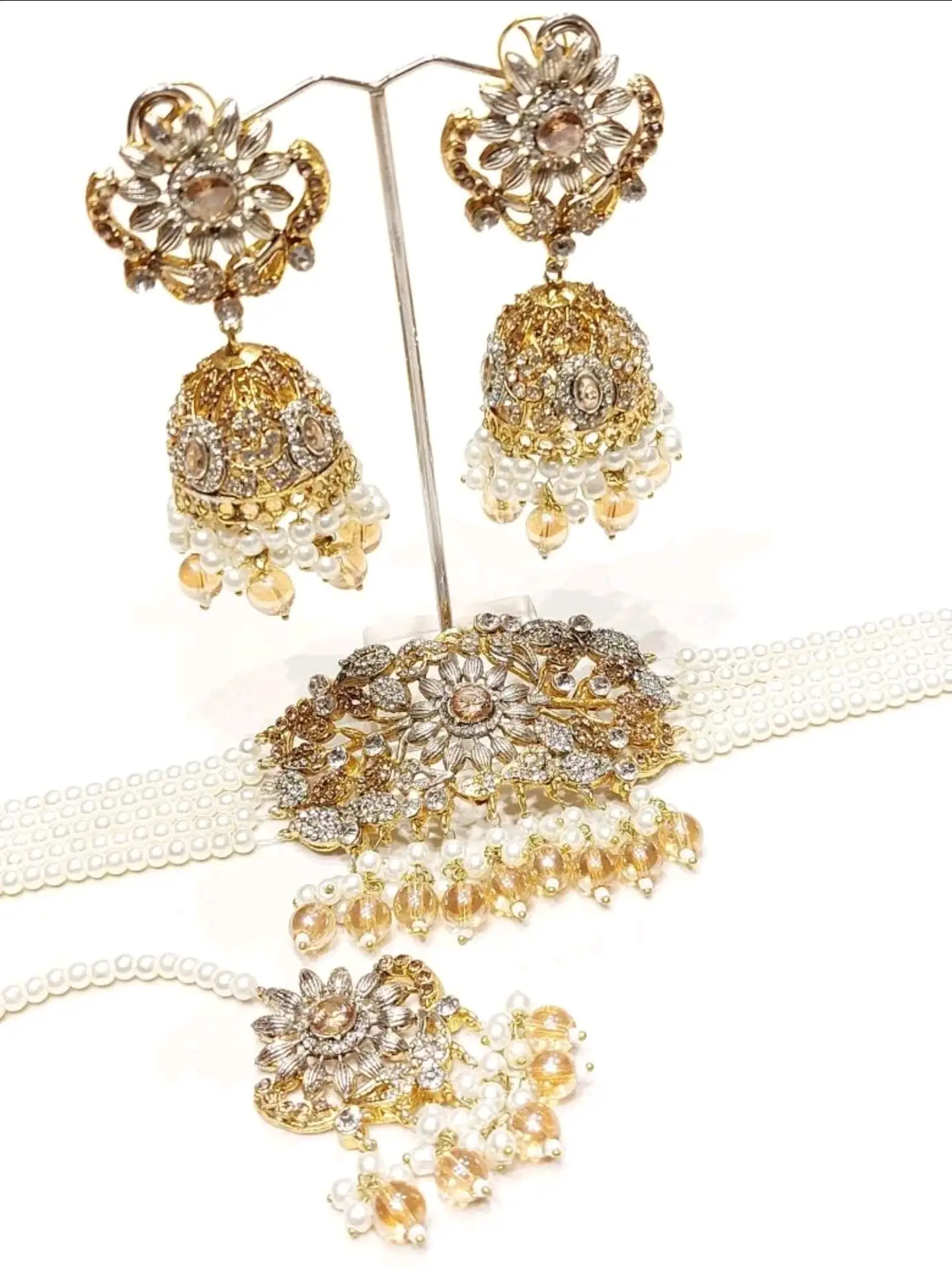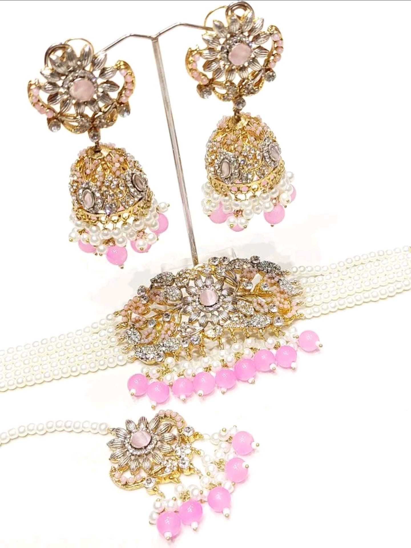 Add a touch of sophistication to your look with this elegant gold-plated choker set. Crafted with precision and adorned with sparkling stones, this set includes a matching pair of earrings to complete your ensemble. Perfect for parties, weddings, and festive occasions, it combines traditional charm with modern elegance.