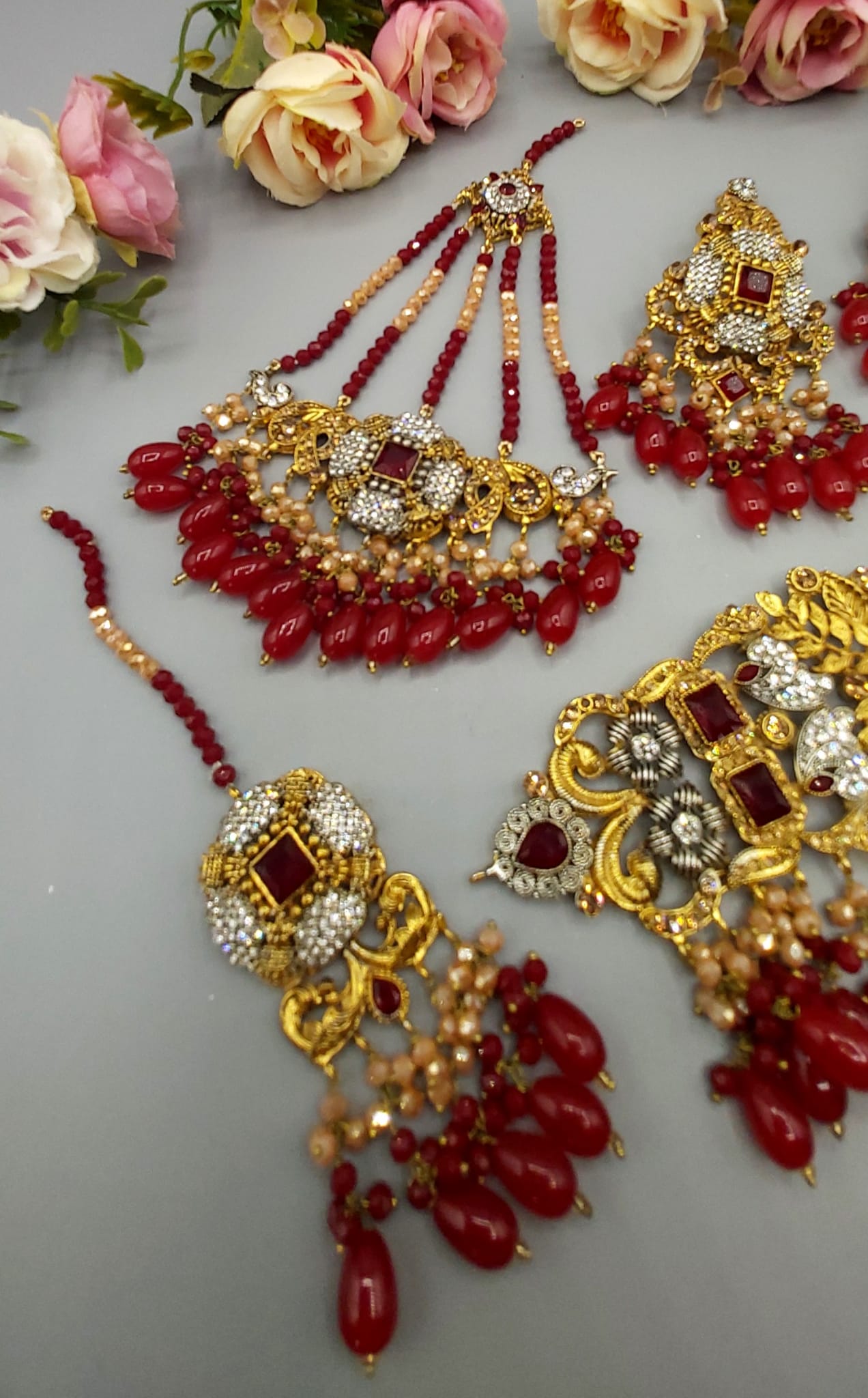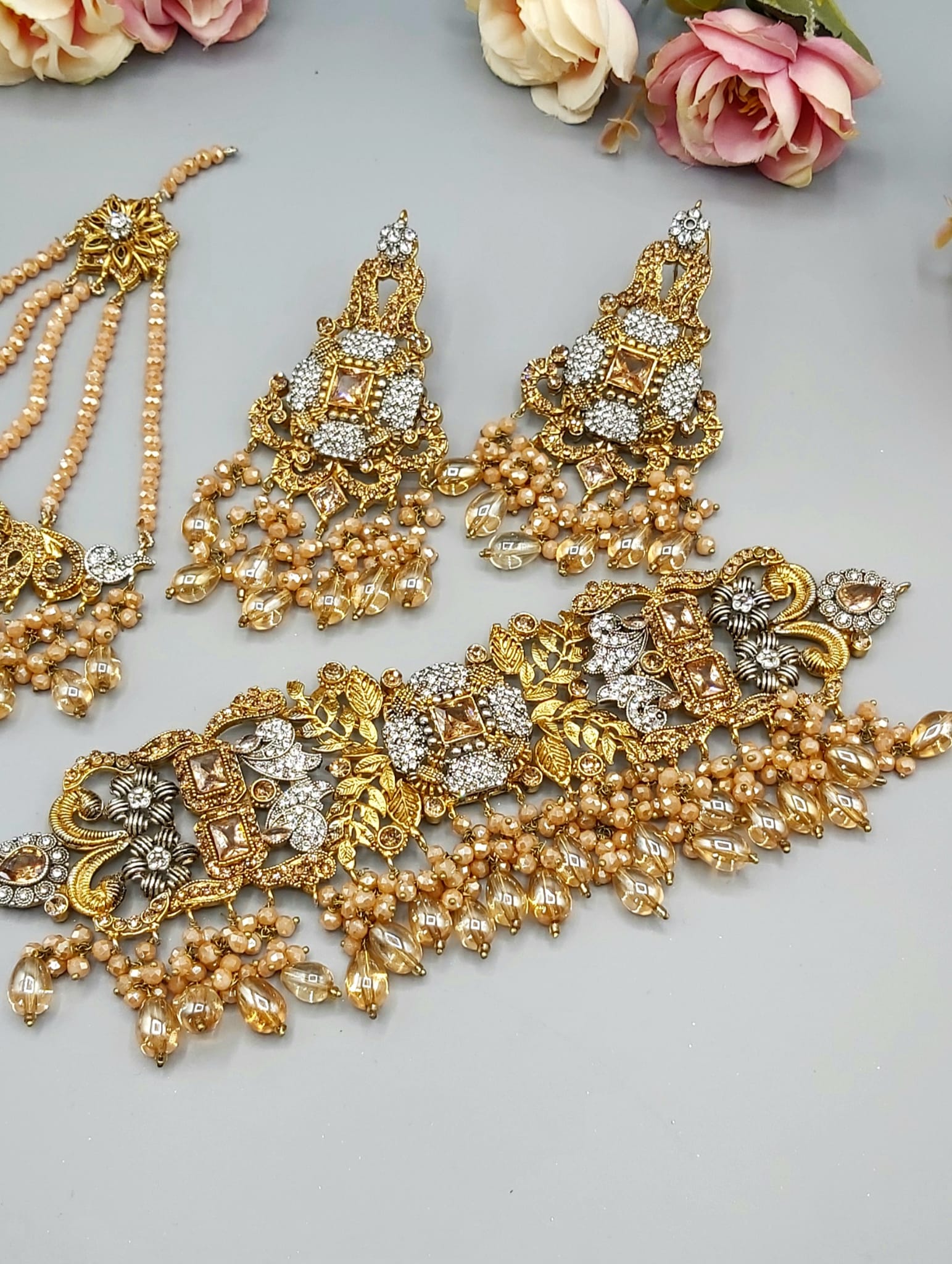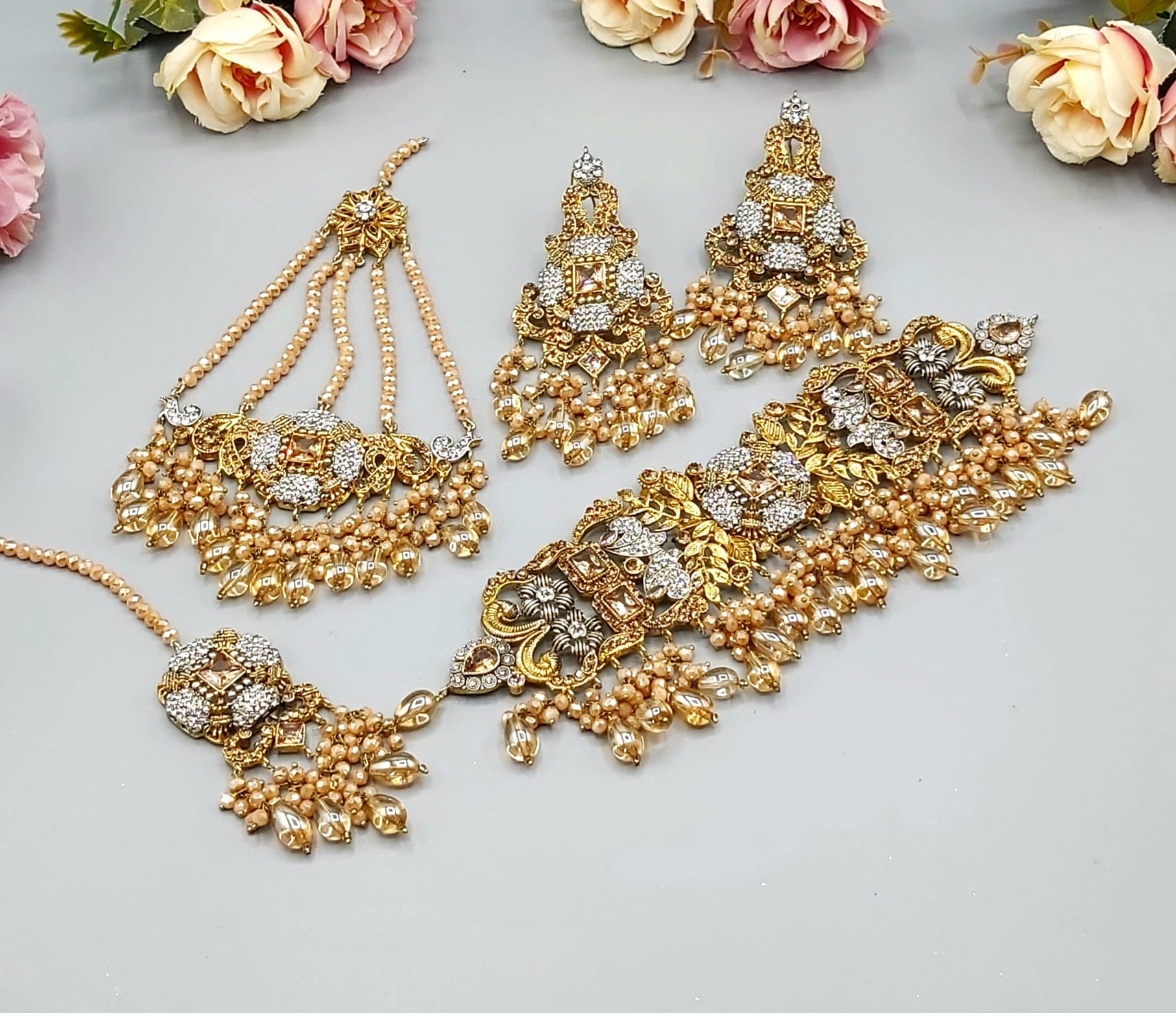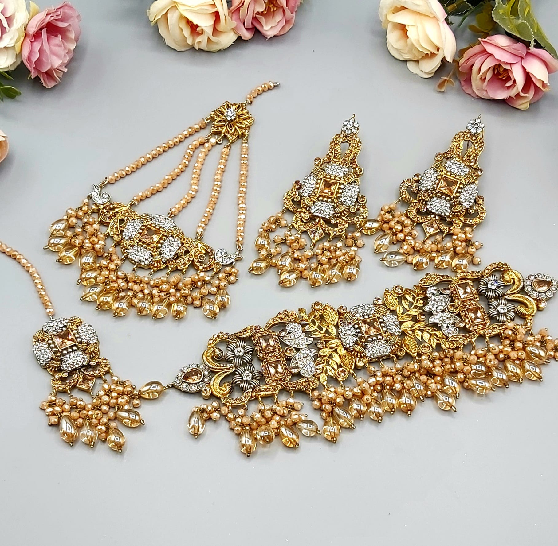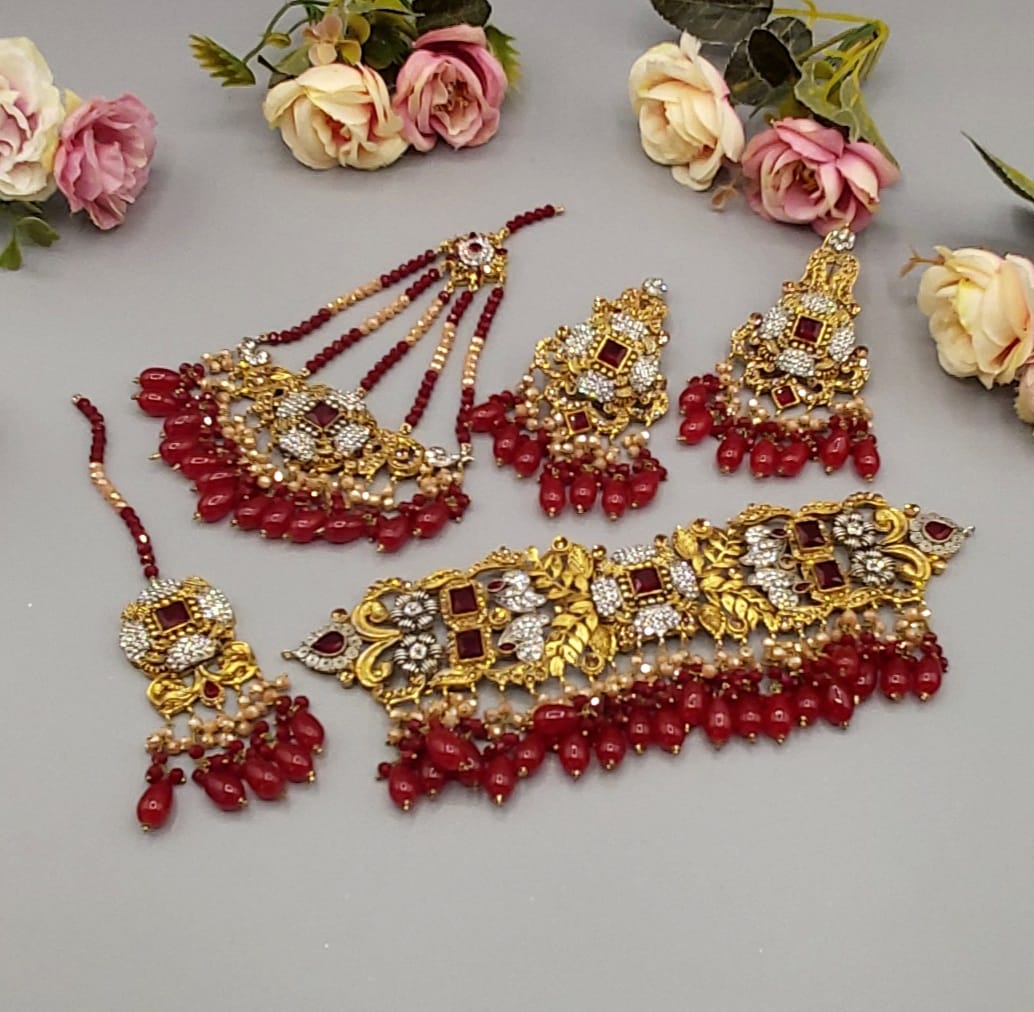 Pakistani Bridal Sets are luxurious and ornate jewelry collections worn by brides on their wedding day. These sets typically include a necklace, earrings, tikka (forehead ornament), jhoomar (side headpiece), nose ring, bangles, and sometimes rings and anklets. Made with gold, kundan, polki, or pearls, they’re often embellished with colorful gemstones to match the bridal outfit, adding elegance and traditional charm to the bride’s look.