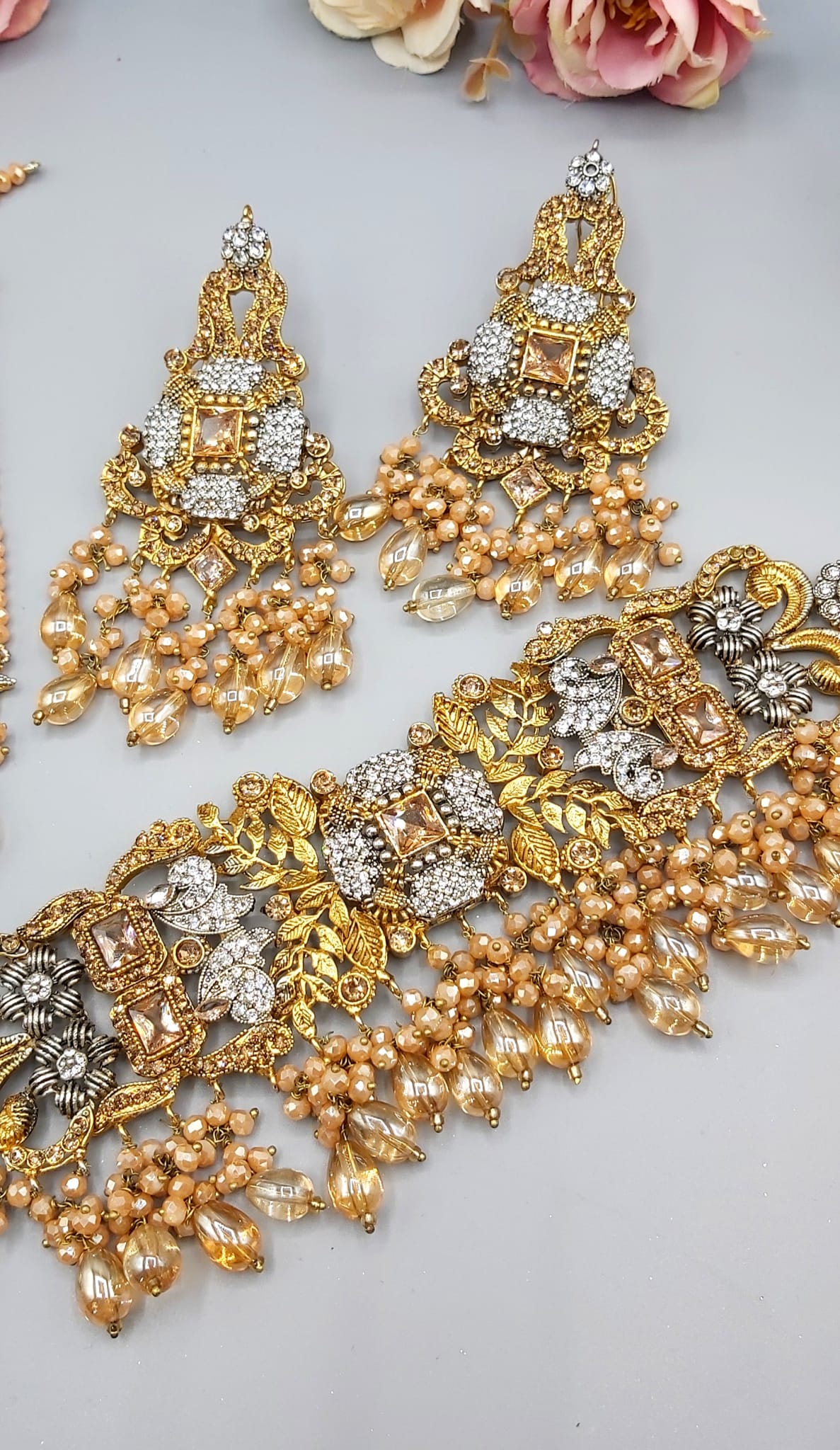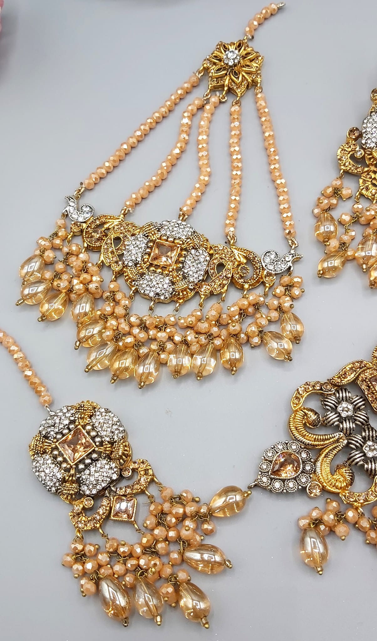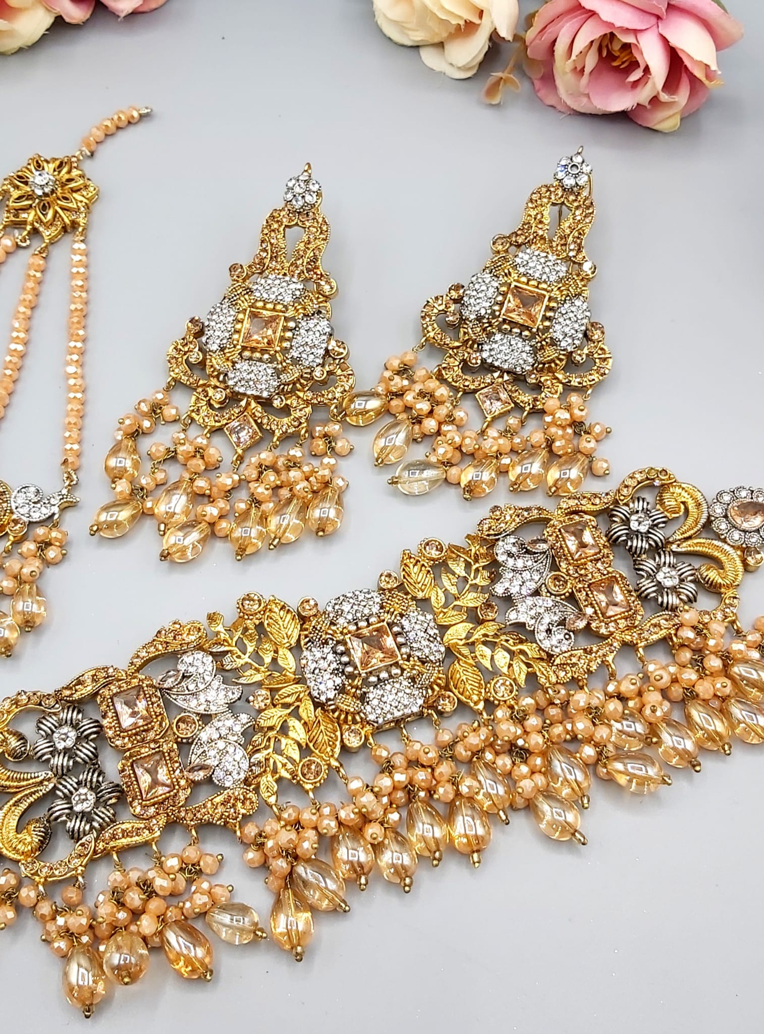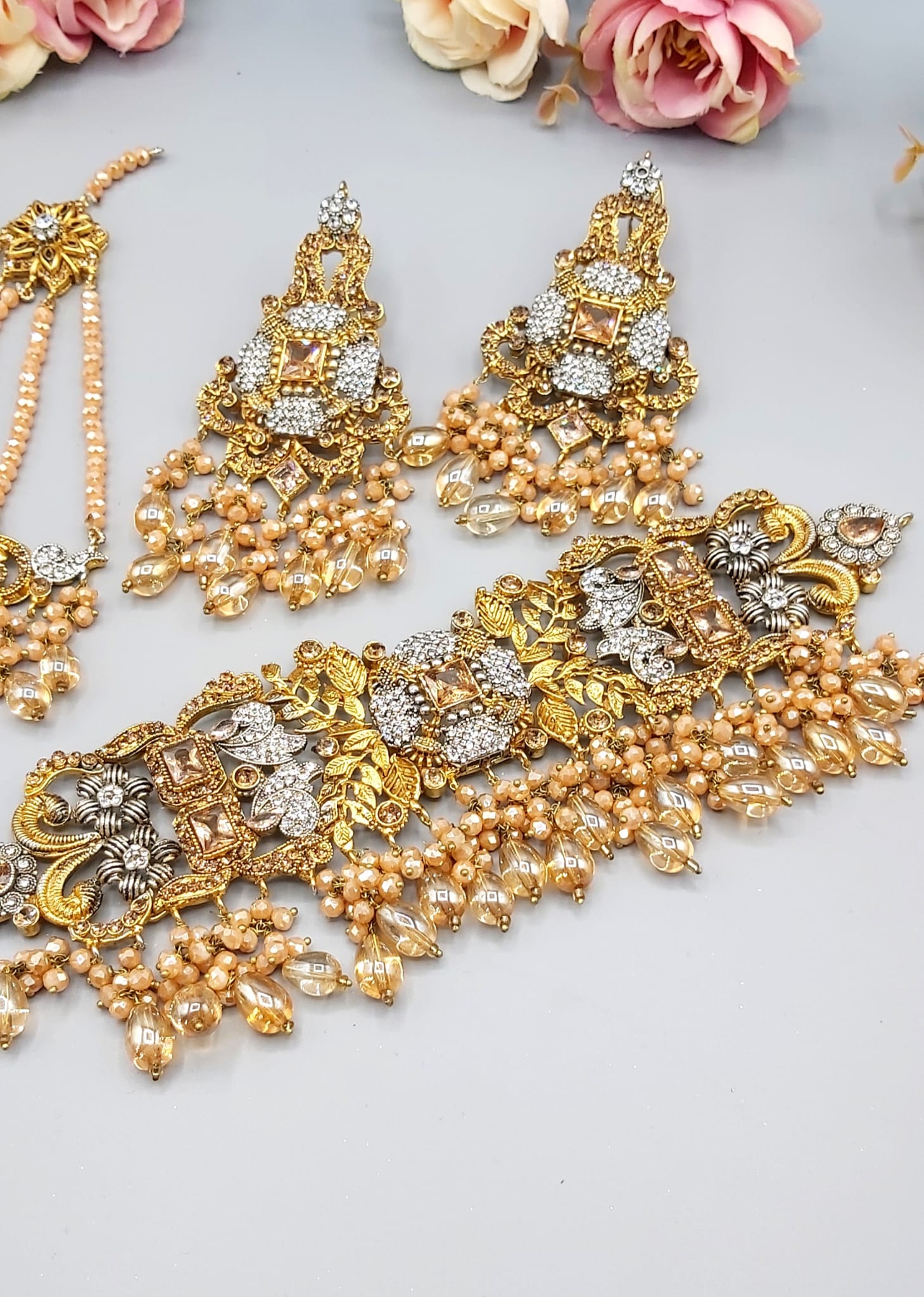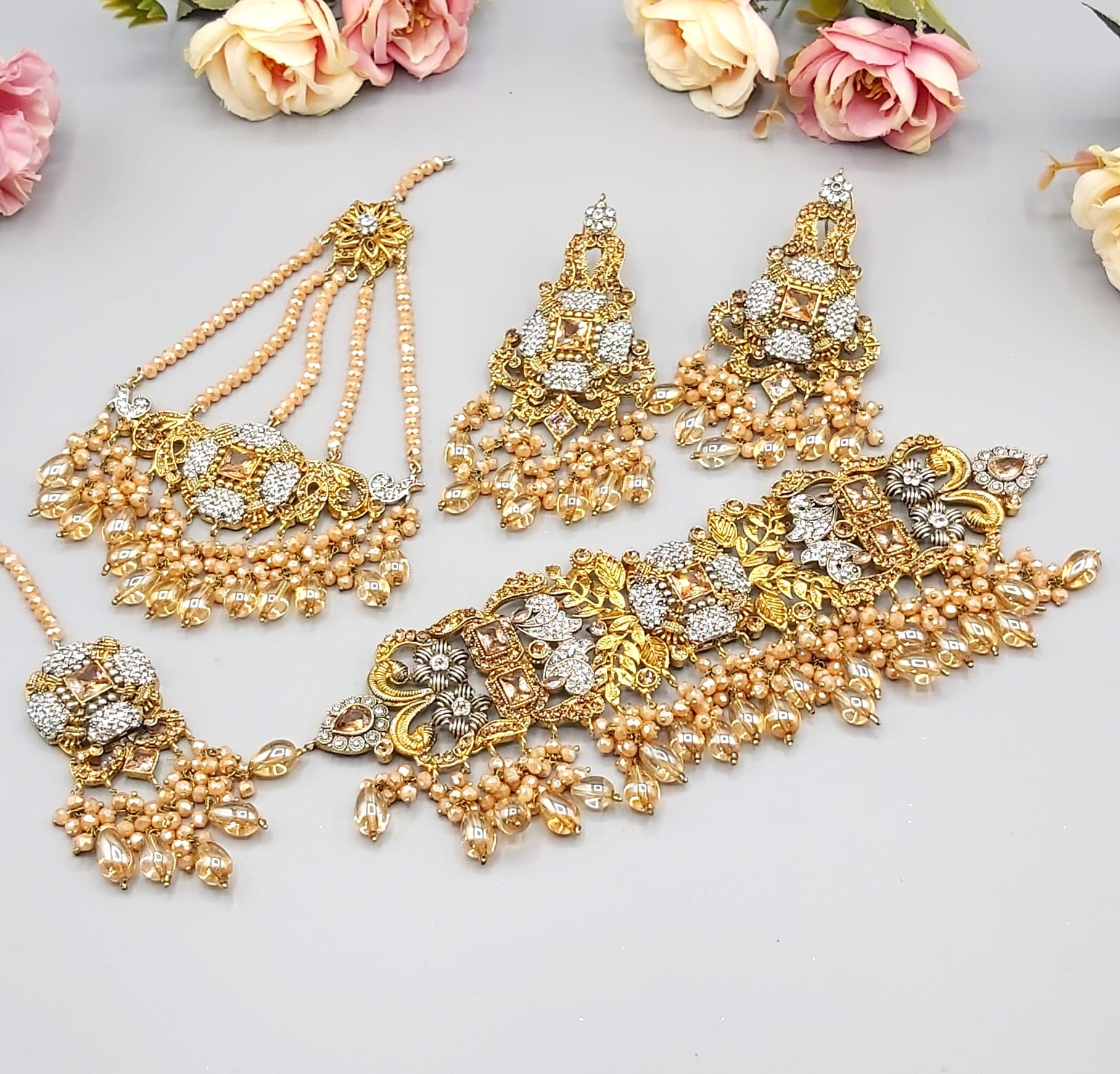 Pakistani Bridal Sets are luxurious and ornate jewelry collections worn by brides on their wedding day. These sets typically include a necklace, earrings, tikka (forehead ornament), jhoomar (side headpiece), nose ring, bangles, and sometimes rings and anklets. Made with gold, kundan, polki, or pearls, they’re often embellished with colorful gemstones to match the bridal outfit, adding elegance and traditional charm to the bride’s look.